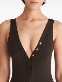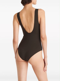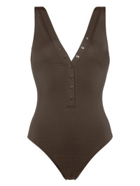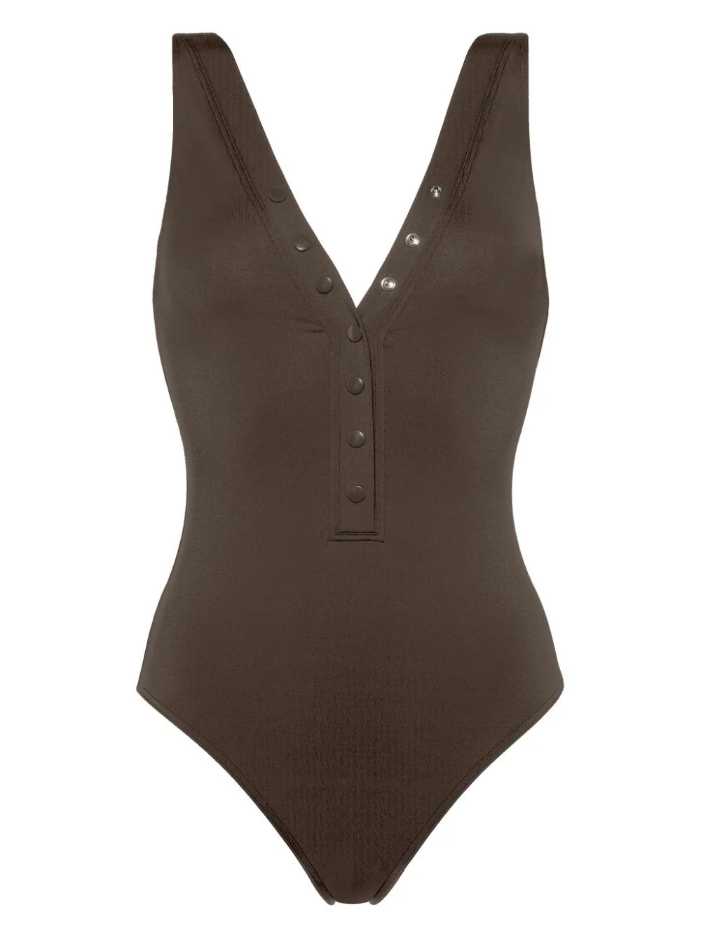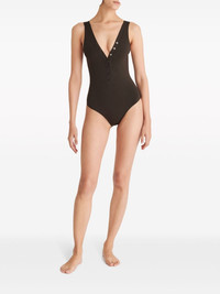 Icone tank swimsuit Highlights - Dark grey - Stretch-design - V-neck - Front button placket - Open back - Be mindful to try on swimwear over your own garments. Made in France Composition Polyamide 84%, Spandex/Elastane 16% SIZE & FIT FittingInformation Designed to offer medium brief coverage This piece fits small – take one size up