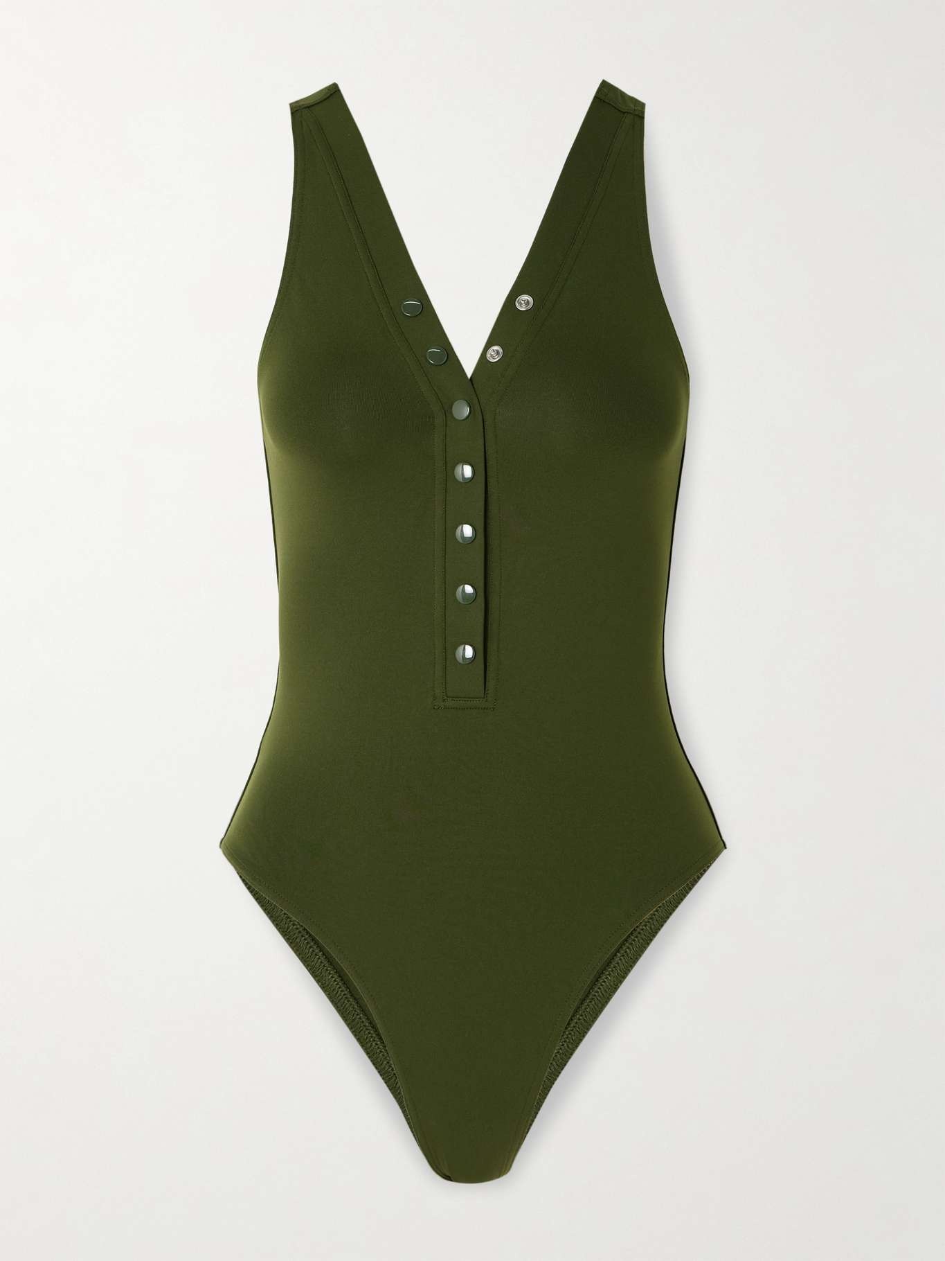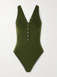 EDITORS'NOTES Eres's latest 'Les Essentiels' swimsuit is made from signature peau douce fabric that's designed to sculpt and contour your curves. It's has a scooped back and adjustable V-neckline. Style it with a pareo for poolside drinks. SIZE & FIT - Fits true to size, take your normal size - Medium brief coverage - French sizing DETAILS & CARE - Army-green stretch-polyamide - Snap fastenings along front - 84% polyamide, 16% spandex; lining: 68% polyamide, 32% elastane - Machine wash - Designer color: Moss Green - Lotion, sunscreen, oil and chlorine can cause discoloration of this item; this is not a manufacturing defect. Please follow care instructions to keep your swimwear in the best condition