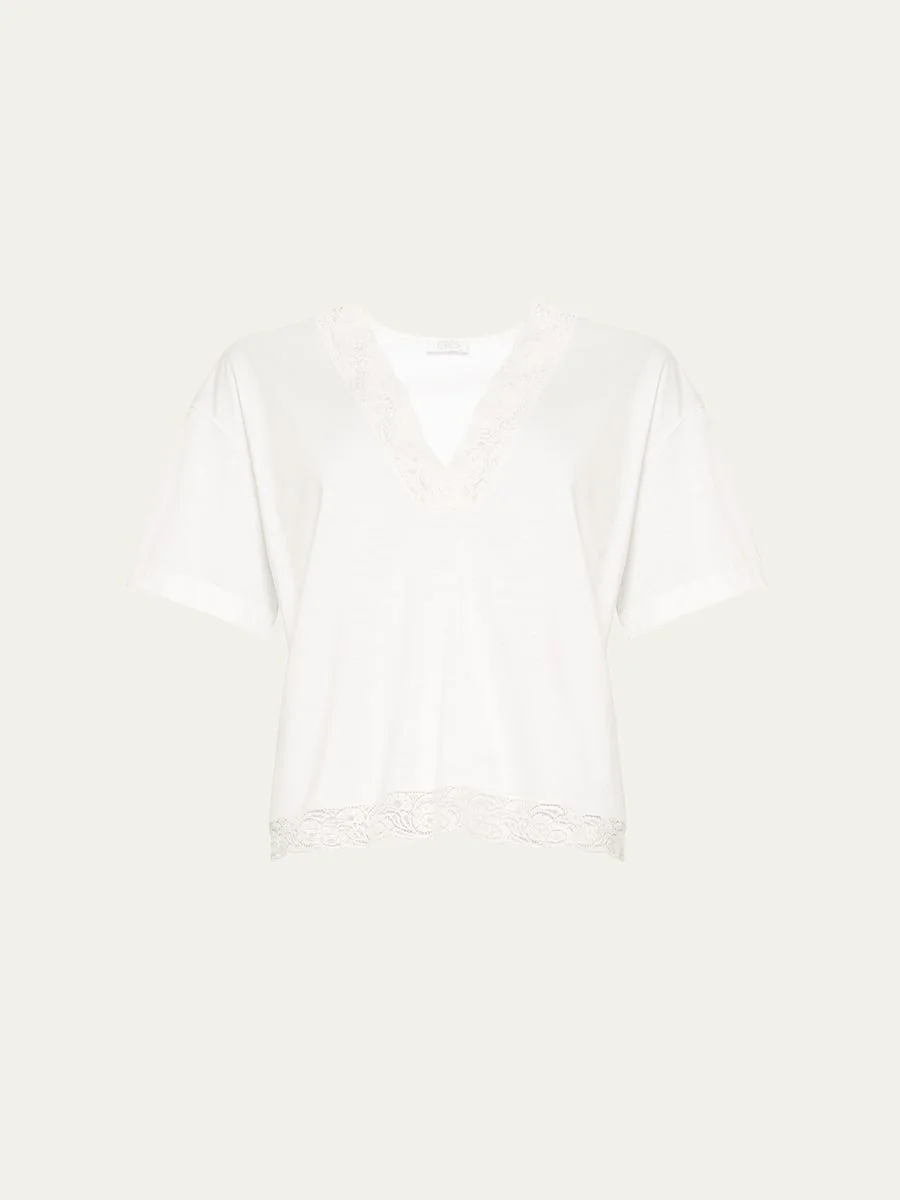 Eres "Ideale" shirt with floral lace trim V neckline Drop shoulders Short sleeves Relaxed fit Pullover style Nylon/polyamide Made in France