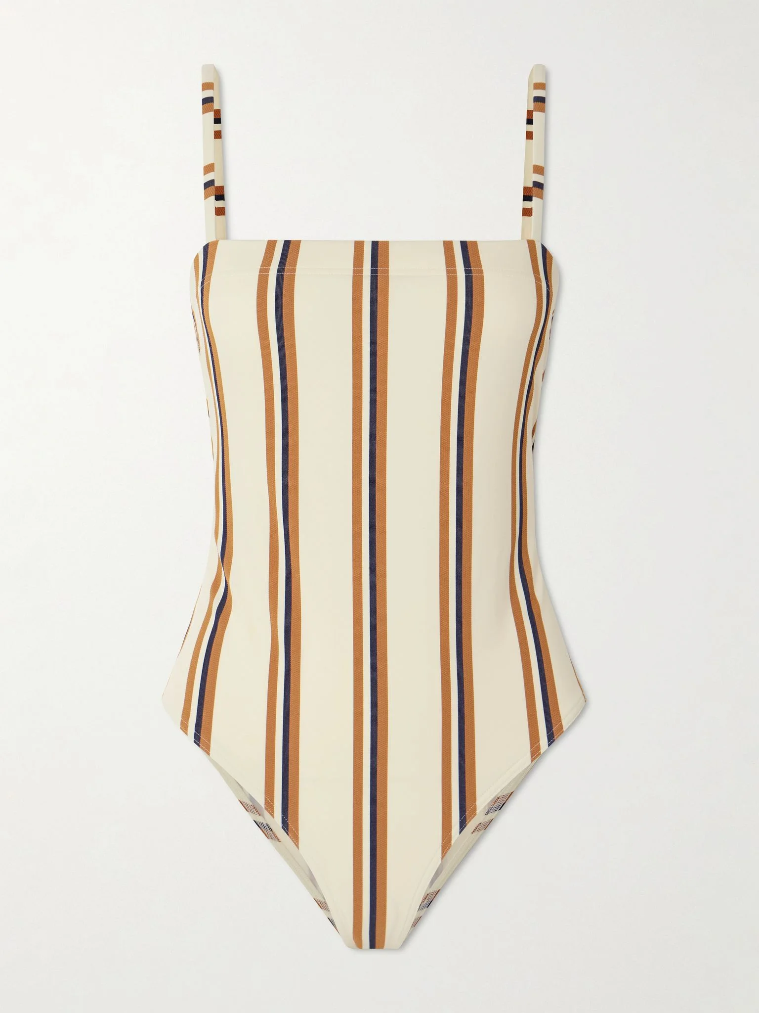 Eres favors timeless shapes, so you'll return to its swimwear year after year. This 'Iode' swimsuit is made from quick-drying stretch fabric that's jacquard-woven with deckchair-inspired stripes and has a straight neckline and thin straps. It'll look great worn with shorts during al fresco dining, too. Small to size. See Size & Fit notes. Size & Fit - Fits small to size, take one size larger than normal - Medium brief coverage - Model is 175cm/ 5'9" and is wearing a FR 38 Details & Care - Ivory, brown and navy stretch-polyamide - Pulls on - 68% polyamide 32% elastane - Machine wash - Designer color: Rayure Sable Fin - Lotion, sunscreen, oil and chlorine can cause discoloration of this item; this is not a manufacturing defect. Please follow care instructions to keep your swimwear in the best condition