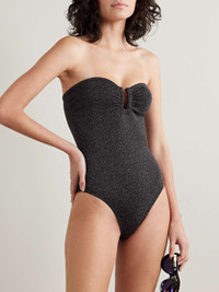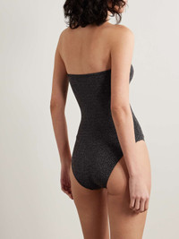 EDITORS'NOTES Eres' 'Scintillant' swimsuit is made from metallic stretch fabric that's inspired by a sunset shimmering on water. Modeled on the label's signature 'Cassiopee' style, it has a strapless neckline with internal gumming to keep it in place and a U-shaped ring at the center. Small to size. See Size & Fit notes. SIZE & FIT Model measurements: - Fits small to size, take one size larger than normal - Medium brief coverage - Model is 177cm/ 5'10", bra size 32B and is wearing an FR 38 - Bust: 81cm/ 32" - Waist: 61cm/ 24” - Hip: 81cm/ 32" DETAILS & CARE - Black and silver stretch-polyamide and polyester-blend - Pulls on - 74% polyamide, 21% polyester 5% spandex - Machine wash - Lotion, sunscreen, oil and chlorine can cause discoloration of this item; this is not a manufacturing defect. Please follow care instructions to keep your swimwear in the best condition