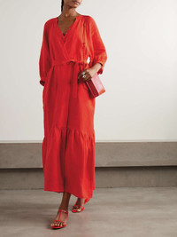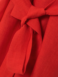 EDITORS'NOTES Eres' 'Joie' dress feels light and airy - a result of both the linen and the billowy, tiered silhouette. It's cut with a belted, wrap-effect front that falls to a maxi hemline. Style yours with woven accessories. SIZE & FIT Model measurements: - Fits true to size, take your normal size - Wraparound design, ties at the waist for a flexible fit - Lightweight, non-stretchy fabric - Model is 180cm/ 5'11" and is wearing a size Small - Bust: 80cm/ 31.5" - Waist: 65cm/ 25.5" - Hip: 89cm/ 35" DETAILS & CARE - Red linen - Slips on - 100% linen - Machine wash or dry clean
