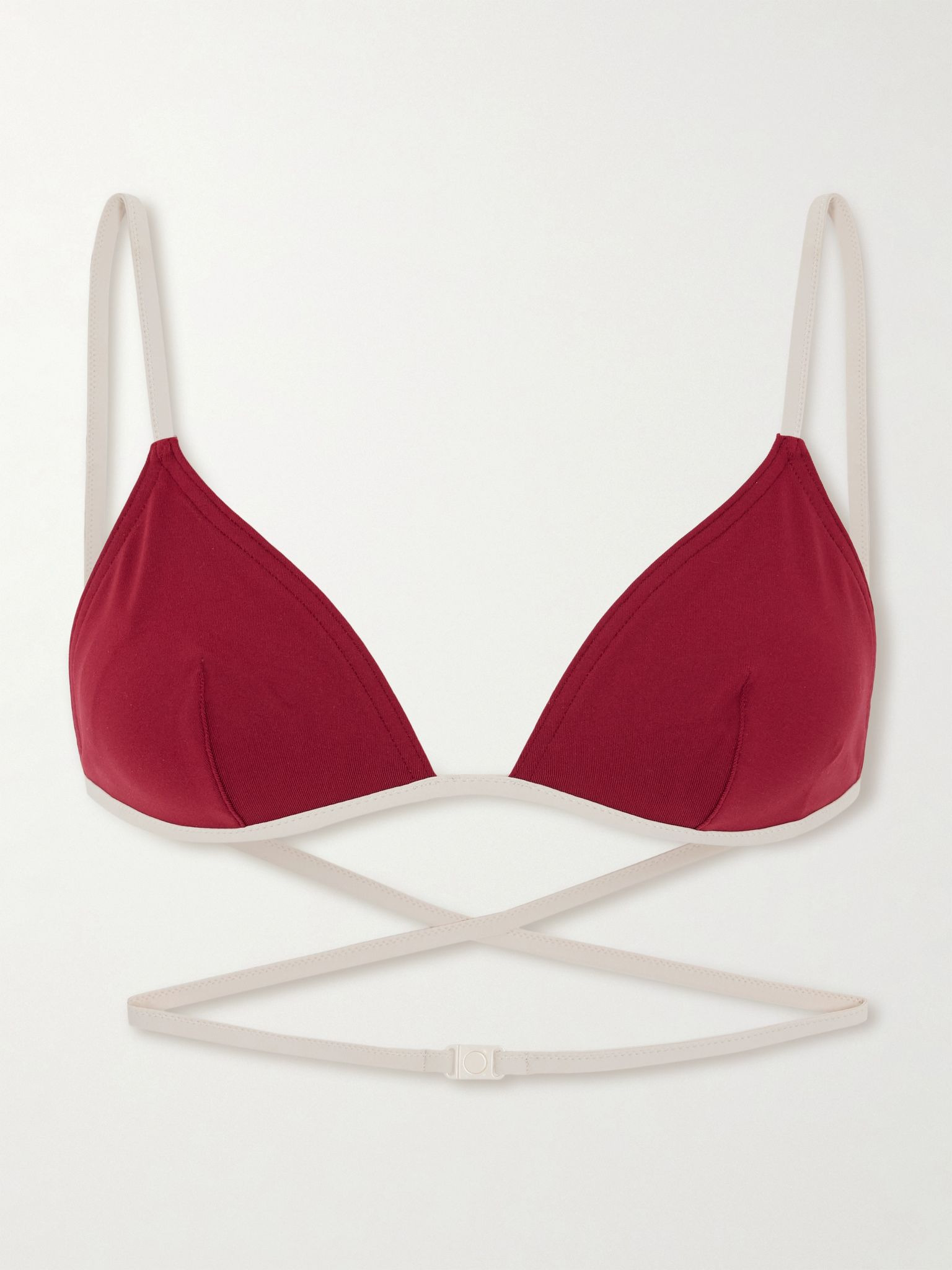 Eres' 'Karen' bikini top has slim white straps that crisscross at the back and wrap around your waist, creating a cool belted look. It's made from the brand's signature peau douce fabric and has classic triangle cups with darting. Wear yours with the coordinating 'Anita' briefs in our edit. Details & Care - Red and white stretch-polyamide - Clasp fastening at front - 78% polyamide, 22% elastane - Hand wash - Lotion, sunscreen, oil and chlorine can cause discoloration of this item; this is not a manufacturing defect. Please follow care instructions to keep your swimwear in the best condition
