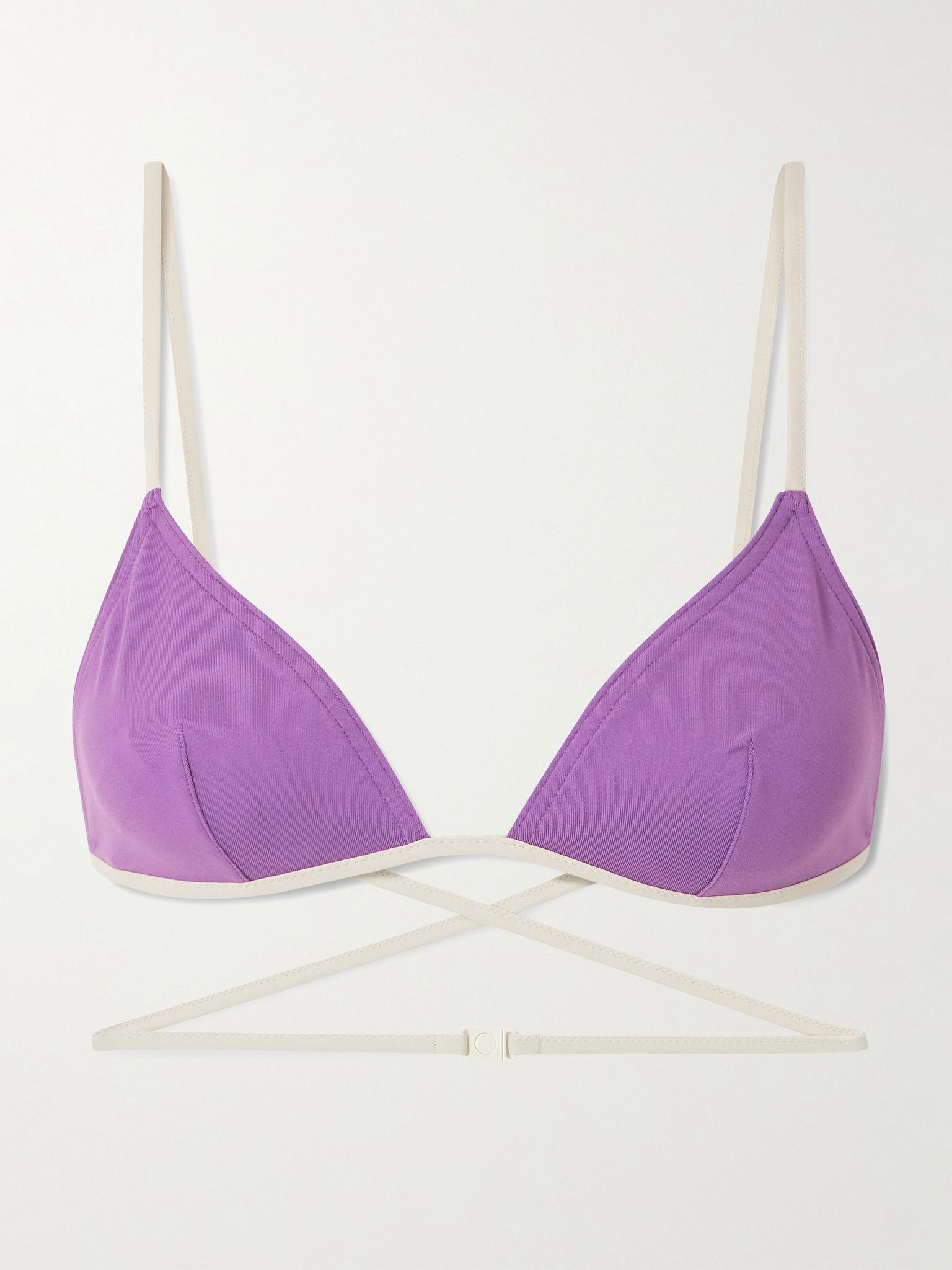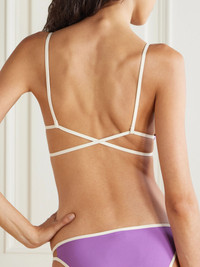 Eres' 'Karen' bikini top has slim white straps that crisscross at the back and wrap around your waist, creating a cool belted look. It's made from the brand's signature peau douce fabric and has classic triangle cups with darting. Wear yours with the coordinating 'Anita' briefs in our edit. Size & Fit - Fits true to size, however those who are between sizes should take the larger size - Triangle style - Model is 175cm/ 5'9", bra size 32C and is wearing a FR 38 Details & Care - Purple and white stretch-polyamide - Clasp fastening at front - 78% polyamide, 22% elastane - Hand wash - Lotion, sunscreen, oil and chlorine can cause discoloration of this item; this is not a manufacturing defect. Please follow care instructions to keep your swimwear in the best condition