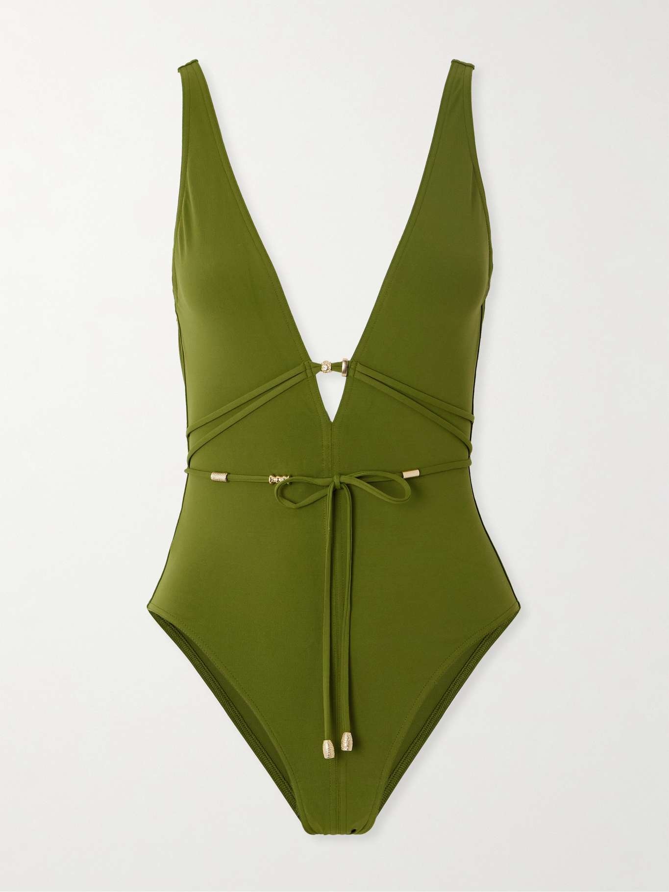 Part of the 'Tresor' line which translates to 'Treasure', Eres' 'Lagon' swimsuit is embellished with gleaming gold-tone hardware. It's made from smooth peau douce fabric with an open back and has a belt for definition. Slip on a tonal kaftan for moments outside the water. Small to size. See Size & Fit notes. Size & Fit - Fits small to size, take one size larger than normal - Medium brief coverage - Model is 175cm/ 5'9", bra size 32C and is wearing a FR 38 Details & Care - Green stretch-polyamide - Ties at back - 77% polyamide, 23% elastane - Hand wash - Lotion, sunscreen, oil and chlorine can cause discoloration of this item; this is not a manufacturing defect. Please follow care instructions to keep your swimwear in the best condition