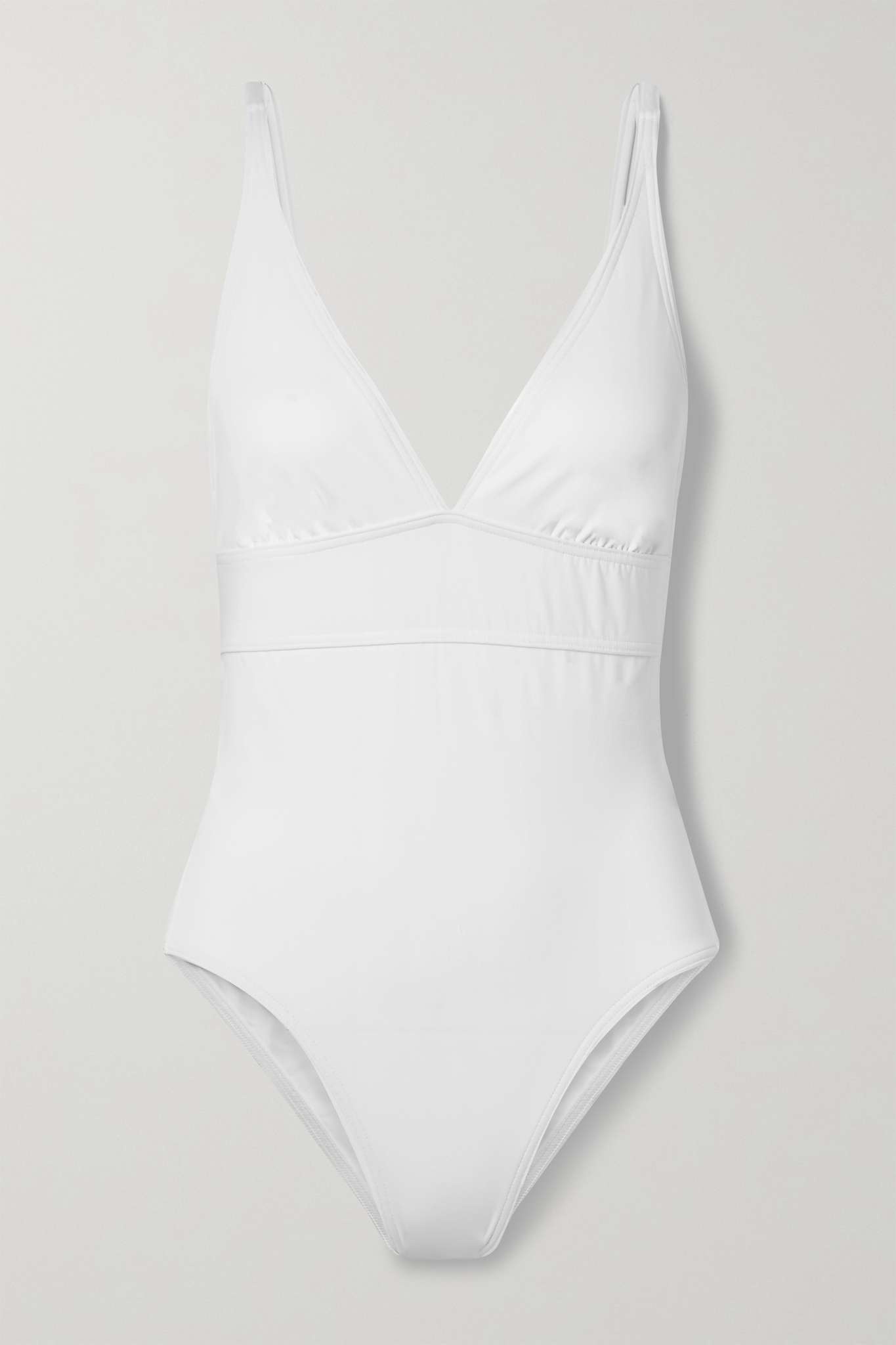 EDITORS'NOTES Eres' 'Larcin' swimsuit is a reliable beach staple thanks to its timeless cut and high-quality construction. Made from the brand's peau douce fabric that won't lose its shape over time, it has a classic V-neckline and supportive band below the bust. Pack it in your tote with oversized sunglasses and sunscreen. SIZE & FIT - Fits small to size, take one size larger than normal - Those with a long torso may wish to take a further size up - Medium brief coverage - French sizing DETAILS & CARE - White stretch-polyamide - Pulls on - 77% polyamide, 23% elastane - Machine wash - Lotion, sunscreen, oil and chlorine can cause discoloration of this item; this is not a manufacturing defect. Please follow care instructions to keep your swimwear in the best condition