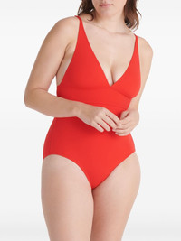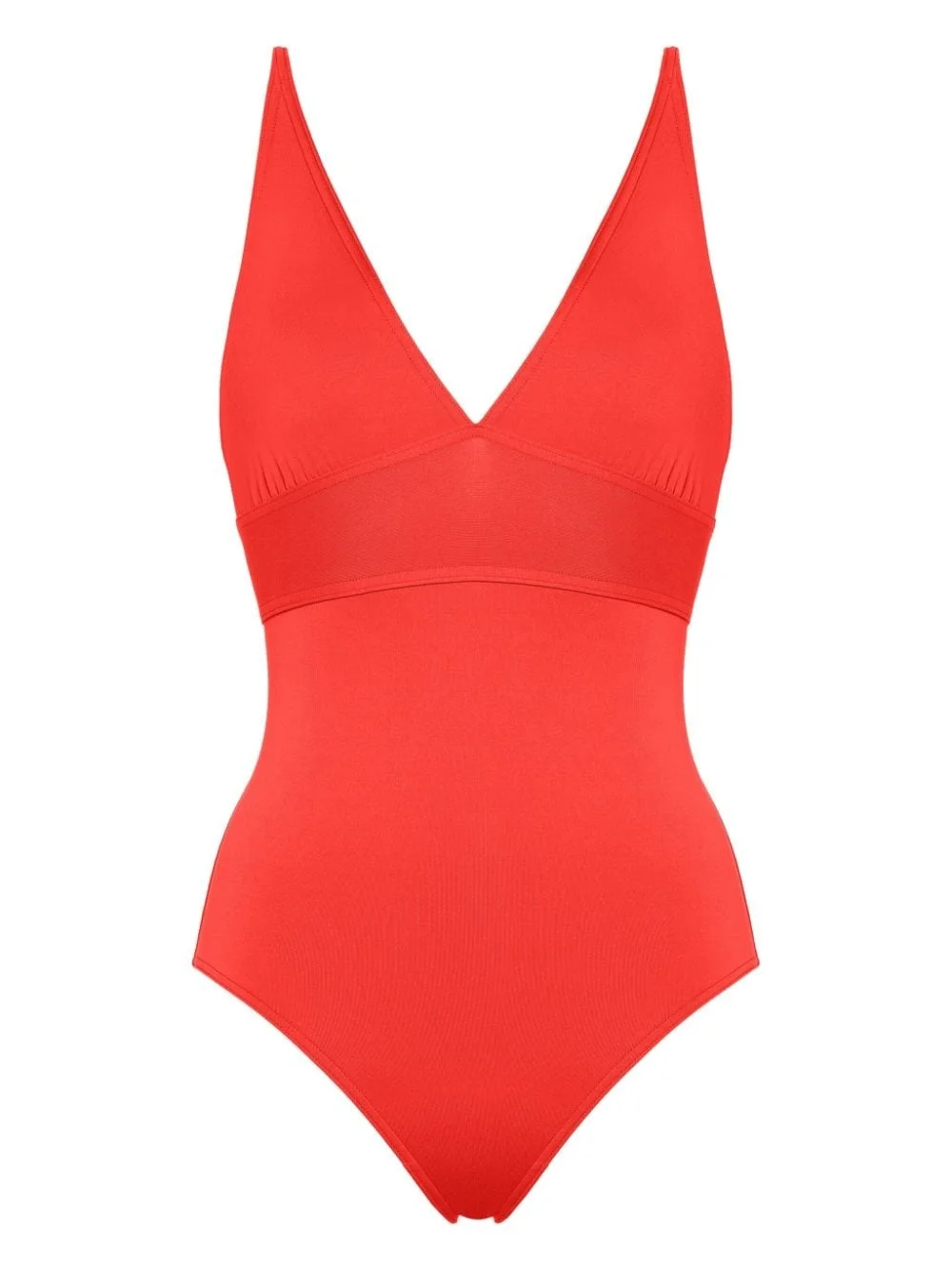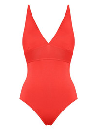 Larcin V-neck swimsuit Highlights - Cardinal red - Stretch-design - V-neck - Square open back - Sleeveless - Be mindful to try on swimwear over your own garments. Made in France Composition Polyamide 84%, Spandex/Elastane 16% SIZE & FIT FittingInformation Designed to offer medium brief coverage This piece fits small – take one size up Measurement LENGTH 25 in(63.5 cm)