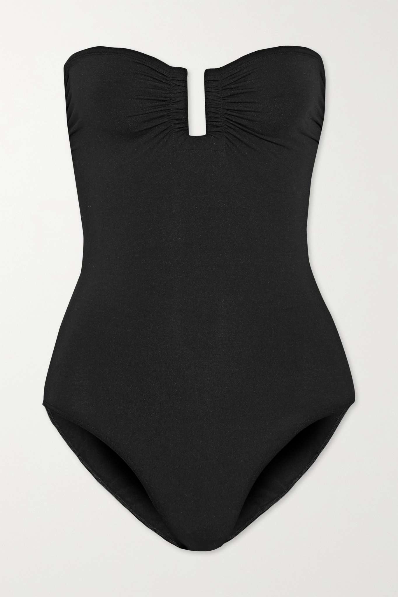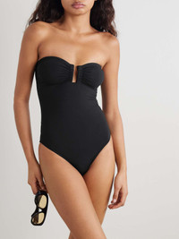 EDITORS'NOTES A timeless summer staple, Eres' sleek bandeau swimsuit is cut from the brand's signature peau douce fabric for an ultra smooth silhouette. It's designed with a concealed U-ring for structure and gummed internal band that keeps it securely in place. SIZE & FIT - Fits small to size, take one size larger than normal - Those with a long torso may wish to take a further size up - Medium brief coverage - French sizing DETAILS & CARE - Black stretch-polyamide - Pulls on - 77% polyamide, 23% elastane - Machine wash - Lotion, sunscreen, oil and chlorine can cause discoloration of this item; this is not a manufacturing defect. Please follow care instructions to keep your swimwear in the best condition