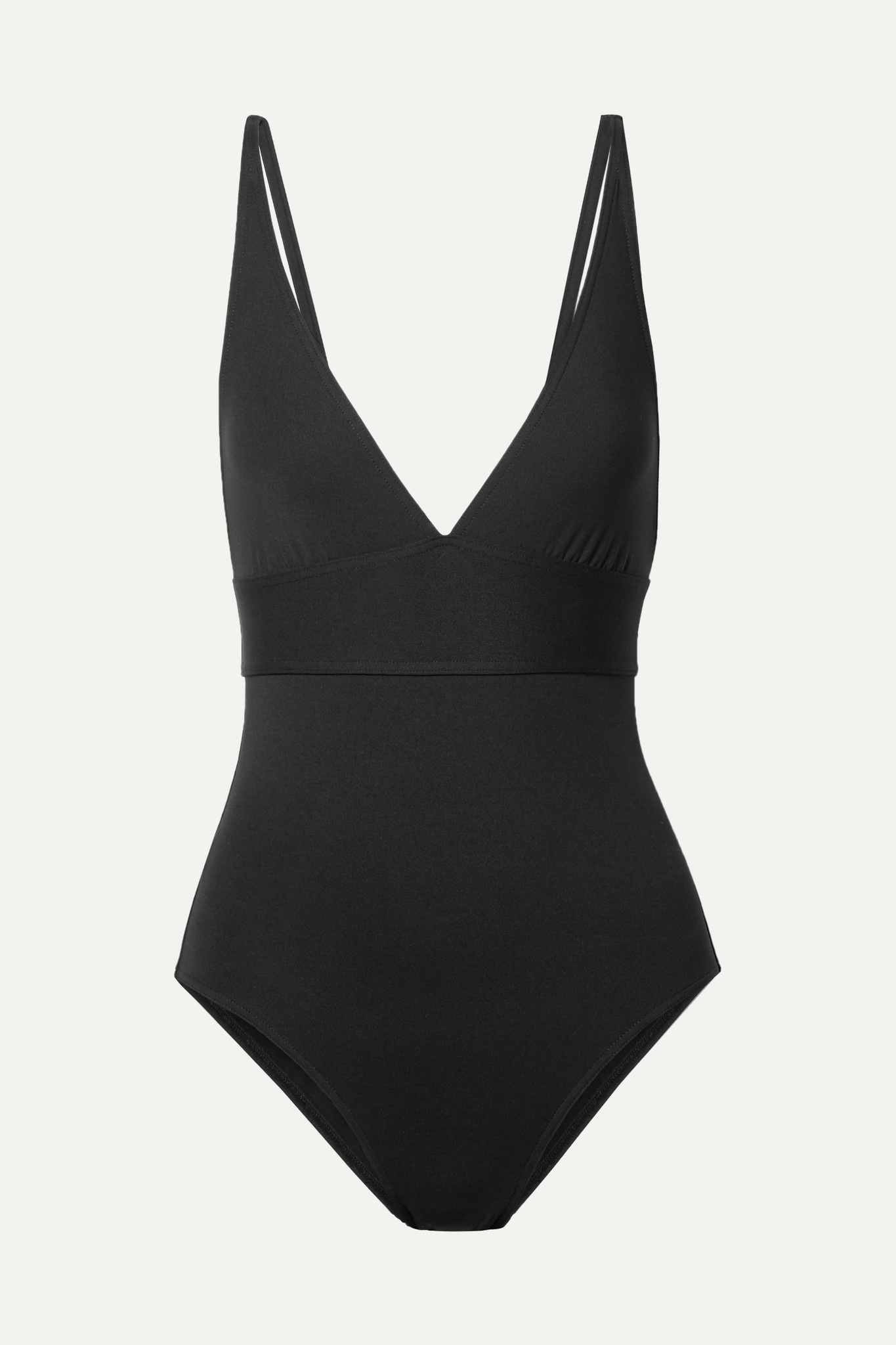 EDITORS'NOTES Eres' black 'Larcin' swimsuit is cut with a flattering deep V-neckline and slim shoulder straps. The soft peau douce fabric is smoothing and sculpting, while the wide band below the cups supports your bust. Wear this timeless one-piece on vacation with sunglasses and an oversized hat. Shown here with: [Alexander McQueen Sunglasses id1105642]. SIZE & FIT - Fits small to size, take one size larger than normal - Those with a long torso may wish to take a further size up - Medium brief coverage - French sizing DETAILS & CARE - Black stretch-polyamide - Pulls on - 77% polyamide, 23% elastane - Machine wash - Made in France
