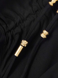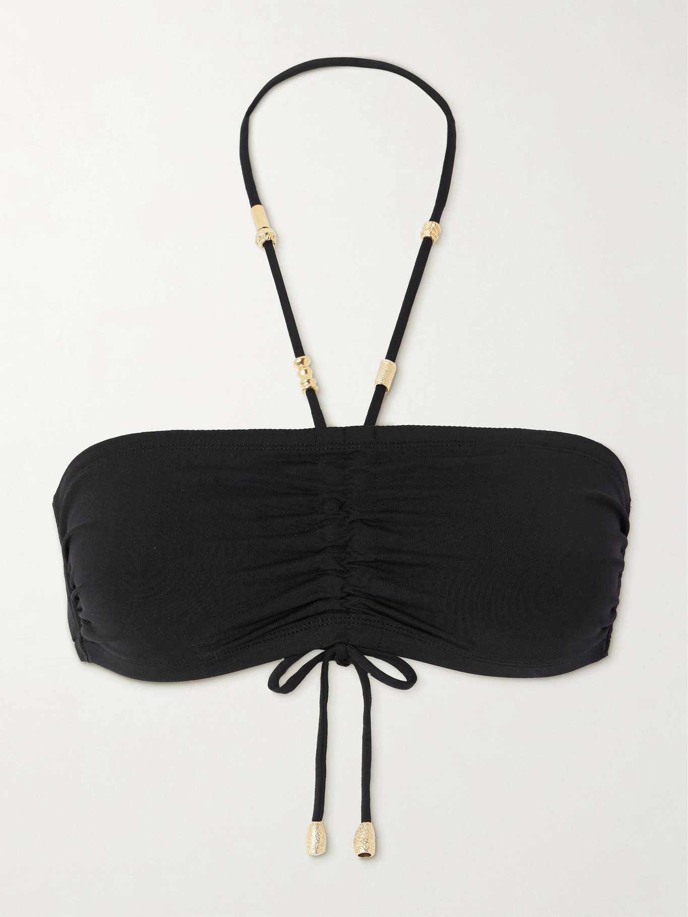 EDITORS'NOTES Eres' 'Melia' bikini top is threaded with sculptural gold-tone embellishments along the halterneck ties. It's been made in France from the label's smoothing peau douce fabric and has center drawstrings that create a gathered shape. Wear yours with the coordinating briefs. SIZE & FIT Model measurements: - Fits true to size, take your normal size - Model is 175cm/ 5'9", bra size 32C and is wearing a FR 38 - Bust: 85cm/ 33.5” - Waist: 63cm/ 25” - Hip: 90cm/ 35.5” DETAILS & CARE - Black stretch-polyamide - Ties at front, clasp fastening at back - 77% polyamide, 23% elastane - Hand wash - Lotion, sunscreen, oil and chlorine can cause discoloration of this item; this is not a manufacturing defect. Please follow care instructions to keep your swimwear in the best condition