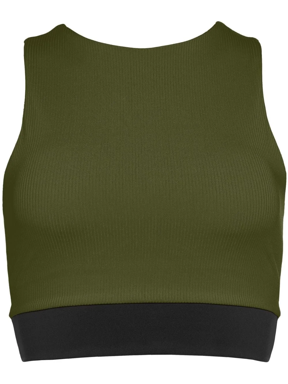 Micheline crop top Highlights - Khaki - Stretch-design - Fine ribbed - Embroidered logo to the rear - Crew neck - Elasticated underband - Sleeveless - Racerback - Cropped - Full lining Made in Italy Composition Polyamide 59%, Spandex/Elastane 41%