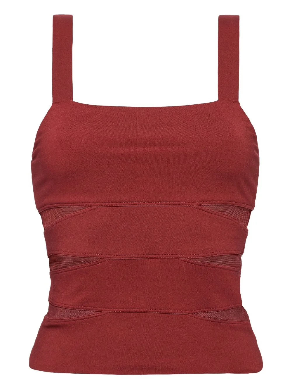 Morgan tee shirt red mesh panels square neck open back Made in Italy Composition Polyamide 73%, Spandex/Elastane 27% Washing instructions Machine Wash
