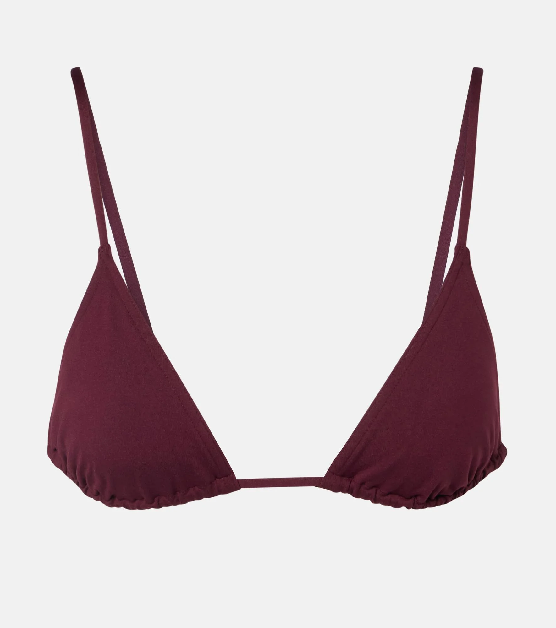 The Mouna bikini top from Eres features a classic triangle cup silhouette and slim straps that can be tied straight or as a halterneck. The piece offers minimal coverage. Product Details - Material: 84% polyamide, 16% elastane - Care instructions: machine wash at 30 degrees - Made in Italy - Designer color name: Quetsche 25H - Item color: burgundy - Self-tie back - Item number: P01105417 Size & Fit - Fits small to size - we recommend trying one size larger - Cup size: A/B - The model seen in the picture is 178cm-5'10", cup size B, and wearing a size FR 38