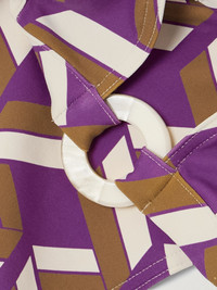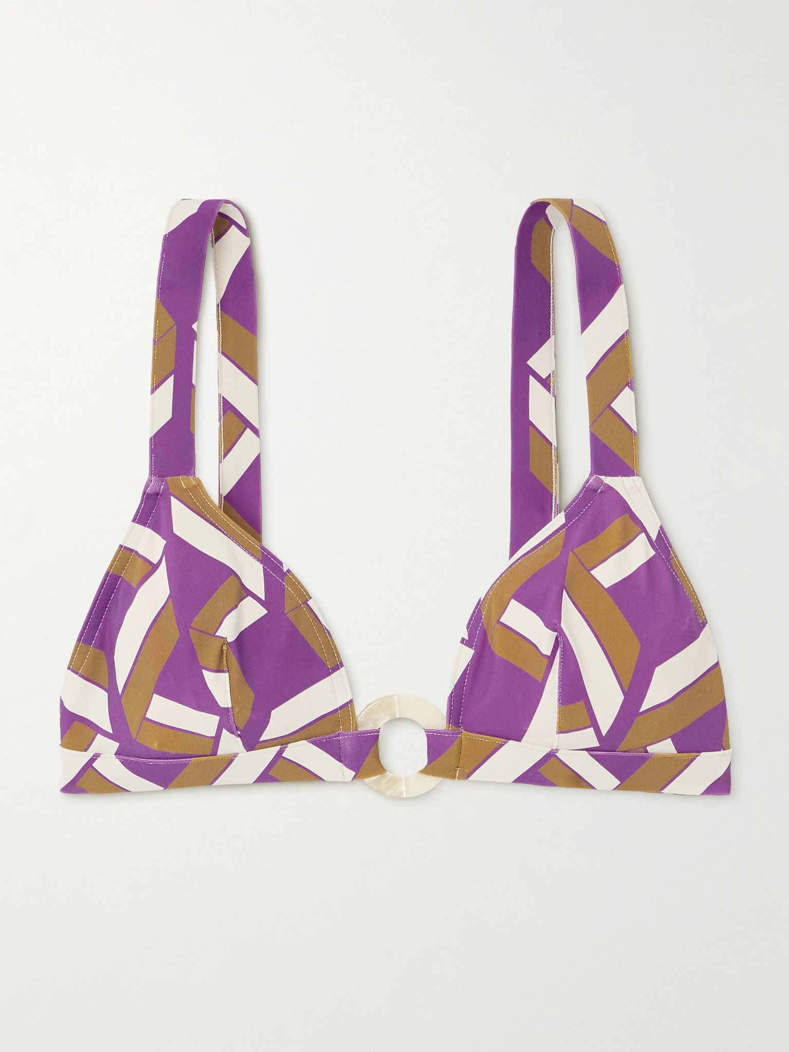 Eres' 'Must' bikini top has been made locally in France from the brand's signature peau douce fabric that's quick-drying and supportive. Printed with a colorful geometric motif, it has darted cups and a pearlescent ring at the center. Small to size. See Size & Fit notes. Size & Fit - Fits small to size, take one size larger than normal - Model is 175cm/ 5'9" and is wearing a FR 38 Details & Care - Purple, olive and white stretch-polyamide - Clasp fastening at back - 77% polyamide, 23% elastane - Hand wash - Lotion, sunscreen, oil and chlorine can cause discoloration of this item; this is not a manufacturing defect. Please follow care instructions to keep your swimwear in the best condition