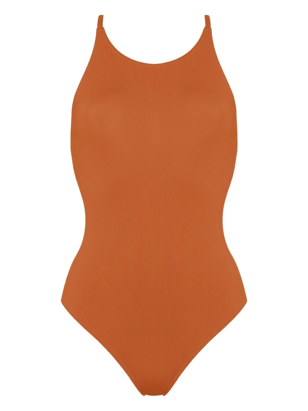 Navale swimsuit Highlights - Brown - Rear criss-cross straps - High neck - Open back - Be mindful to try on swimwear over your own garments. Made in France Composition Polyamide 77%, Spandex/Elastane 23% SIZE & FIT FittingInformation This piece fits small – take one size up