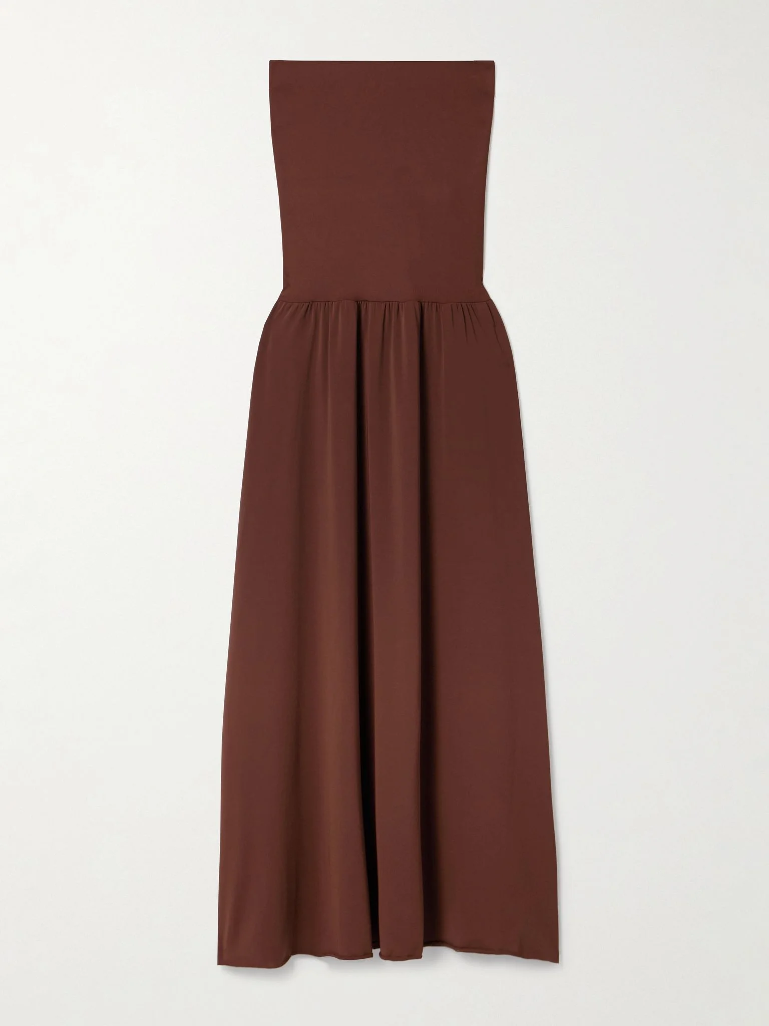 Eres' 'Oda' maxi dress can be styled in a variety of ways, so there'll be more room in your suitcase for shoes - wear it over a bikini as a coverup, or as a skirt with the sculpting bodice folded down. It's made from stretch-jersey in a versatile chocolate hue. Underpin yours with a smoothing strapless bra. Size & Fit - Fits true to size, take your normal size - Designed to be fitted at the bust and waist, loose at the hip - Intended to be worn multiple ways - Lightweight, stretchy fabric - Model is 177cm/ 5'10" and is wearing a size Small Model measurements: - Bust: 79cm/ 31" - Waist: 61cm/ 24" - Hip: 88.9cm/ 35" Details & Care - Chocolate stretch-jersey - Slips on - 94% polyamide, 6% elastane - Machine wash