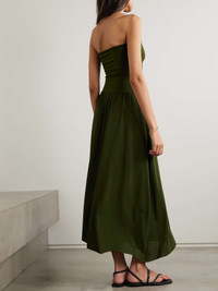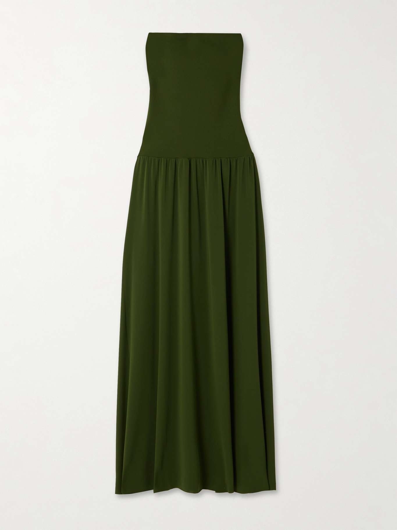 EDITORS'NOTES Eres' 'Oda' maxi dress can be styled in a variety of ways, so there'll be more room in your suitcase for shoes - wear it over a bikini as a coverup, or as a skirt with the sculpting bodice folded down. It's made from signature peau douce stretch-jersey and stretch-crepe in a versatile dark-green hue that's flattering against all skin tones. Underpin yours with a smoothing strapless bra. SIZE & FIT Model measurements: - Fits true to size, take your normal size - Designed to be fitted at the bust and waist, loose at the hip - Mid-weight, slightly stretchy fabric - Model is 180cm/ 5'11" and is wearing a size Small - Bust: 80cm/ 31.5" - Waist: 67cm/ 26" - Hip: 89cm/ 35" DETAILS & CARE - Dark-green stretch-jersey and stretch-crepe - Slips on - Fabric1: 94% polyamide, 6% spandex; fabric2: 84% polyamide, 16% spandex - Machine wash - Designer color: Vert Mousse