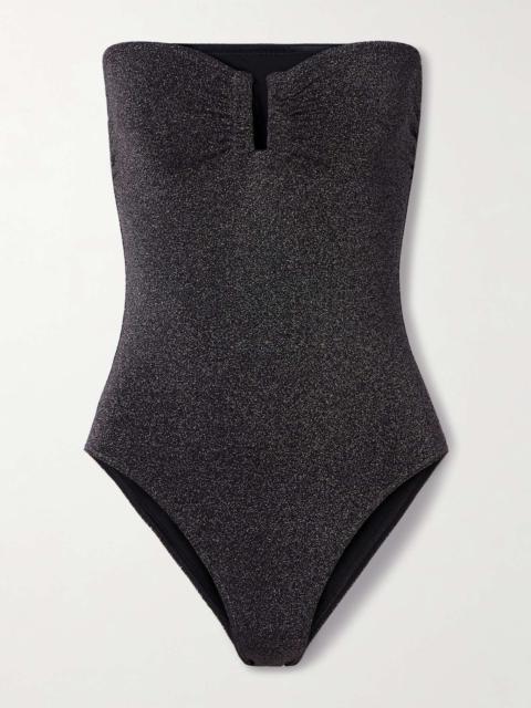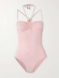 Eres' bathing suit rests on two sets of straps, one laced with movable beads, while the other crisscrosses in the back elegantly. The shirred bust accentuates your figure. Size & Fit - Fits small to size, take one size larger than normal - Medium brief coverage - Model is 175cm/ 5'9", bra size 32C and is wearing a size FR 38 Model measurements: - Bust: 85cm/ 33.5” - Waist: 63cm/ 25” - Hip: 90cm/ 35.5” Details & Care - Pink stretch-polyamide - Ties at back - 77% polyamide, 23% elastane - Hand wash - Lotion, sunscreen, oil and chlorine can cause discoloration of this item; this is not a manufacturing defect. Please follow care instructions to keep your swimwear in the best condition