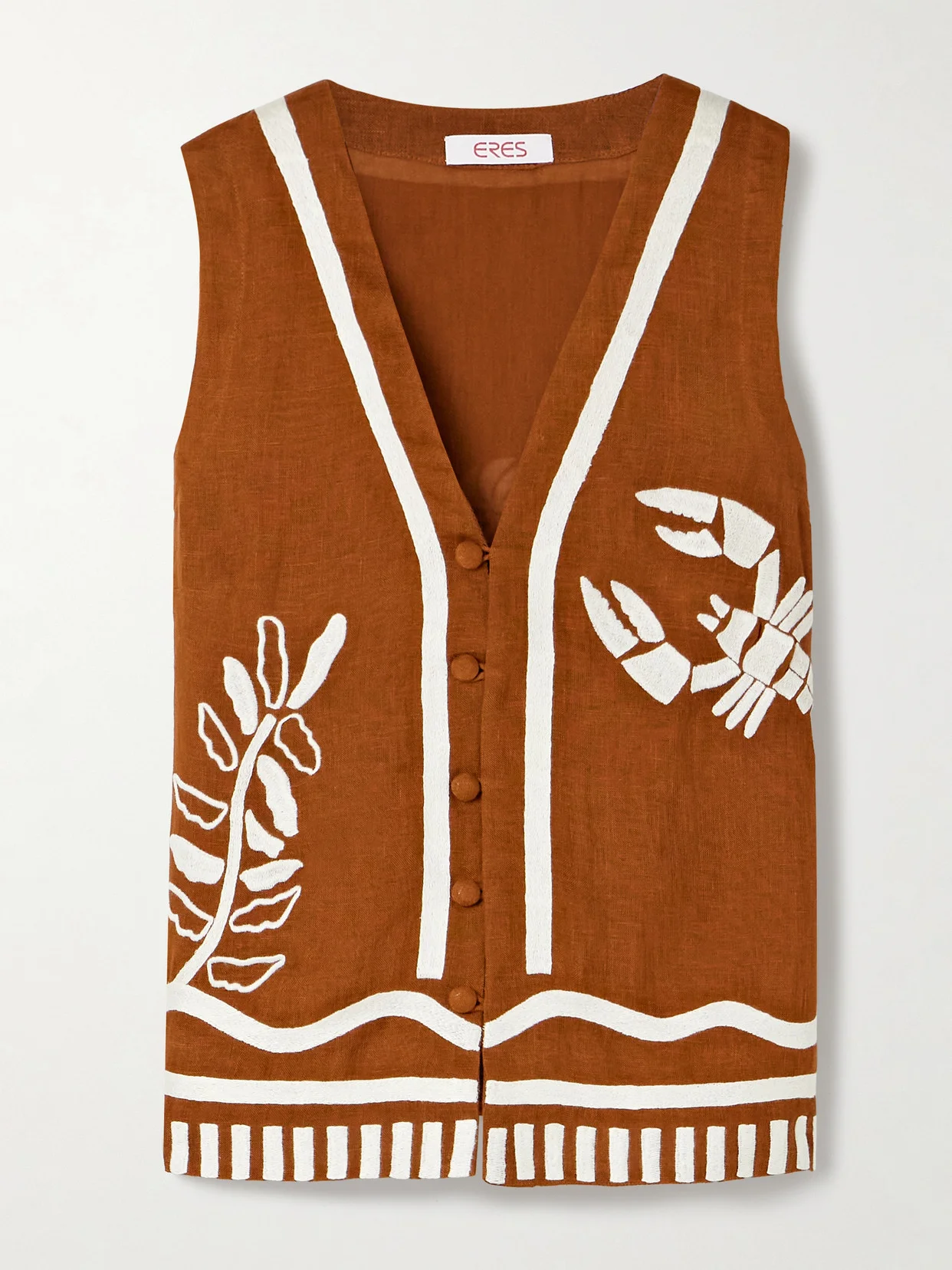 Eres' designs exude a chic yet effortless vibe. This 'Mermaid Oursin' vest is tailored from naturally breathable linen that's playfully embroidered with ocean creatures. Wear yours as a set with the coordinating 'Starfish' skirt.