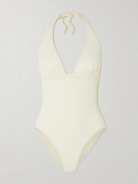 EDITORS'NOTES Eres' 'Paillette' swimsuit is part of the brand's 'The Vogue' collection filled with jacquard fabrics inspired by retro swimming caps. Blended with plenty of stretch, it has a halter neck, supportive grosgrain underband and high-cut legs. Wear yours with a floppy hat while lounging poolside. SIZE & FIT Model measurements: - Fits true to size, take your normal size - Medium brief coverage - Model is 175cm/ 5'9", bra size 32D and is wearing a size FR 38 - Bust: 83cm/ 32.5" - Waist: 67cm/ 26" - Hip: 89cm/ 35" DETAILS & CARE - White jacquard and grosgrain - Ties at neck - 91% polyamide, 9% elastane; lining: 68% polyamide, 32% elastane - Machine wash - Designer color: Sable Fin - Lotion, sunscreen, oil and chlorine can cause discoloration of this item; this is not a manufacturing defect. Please follow care instructions to keep your swimwear in the best condition
