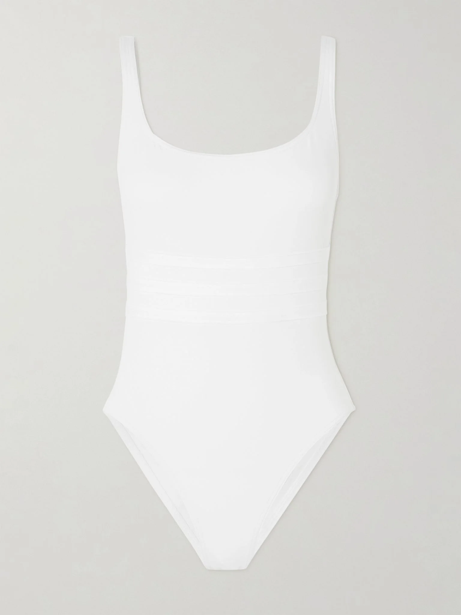 Eres' swimsuit is part of the French label's 'Les Essentiels' collection, which focuses on timeless design and impeccable fit. Made from peau douce stretch fabric, it has a scooped neckline and paneled waist that draws in the eye. Small to size. See Size & Fit notes. Size & Fit - Fits small to size, take one size larger than normal - Medium brief coverage - Model is 175cm/ 5'9", bra size 32D and is wearing a FR 38 Model measurements: - Bust: 83cm/ 32.5" - Waist: 67cm/ 26" - Hip: 89cm/ 35" Details & Care - White stretch-polyamide - Pulls on - 84% polyamide, 16% elastane - Machine wash - Lotion, sunscreen, oil and chlorine can cause discoloration of this item; this is not a manufacturing defect. Please follow care instructions to keep your swimwear in the best condition