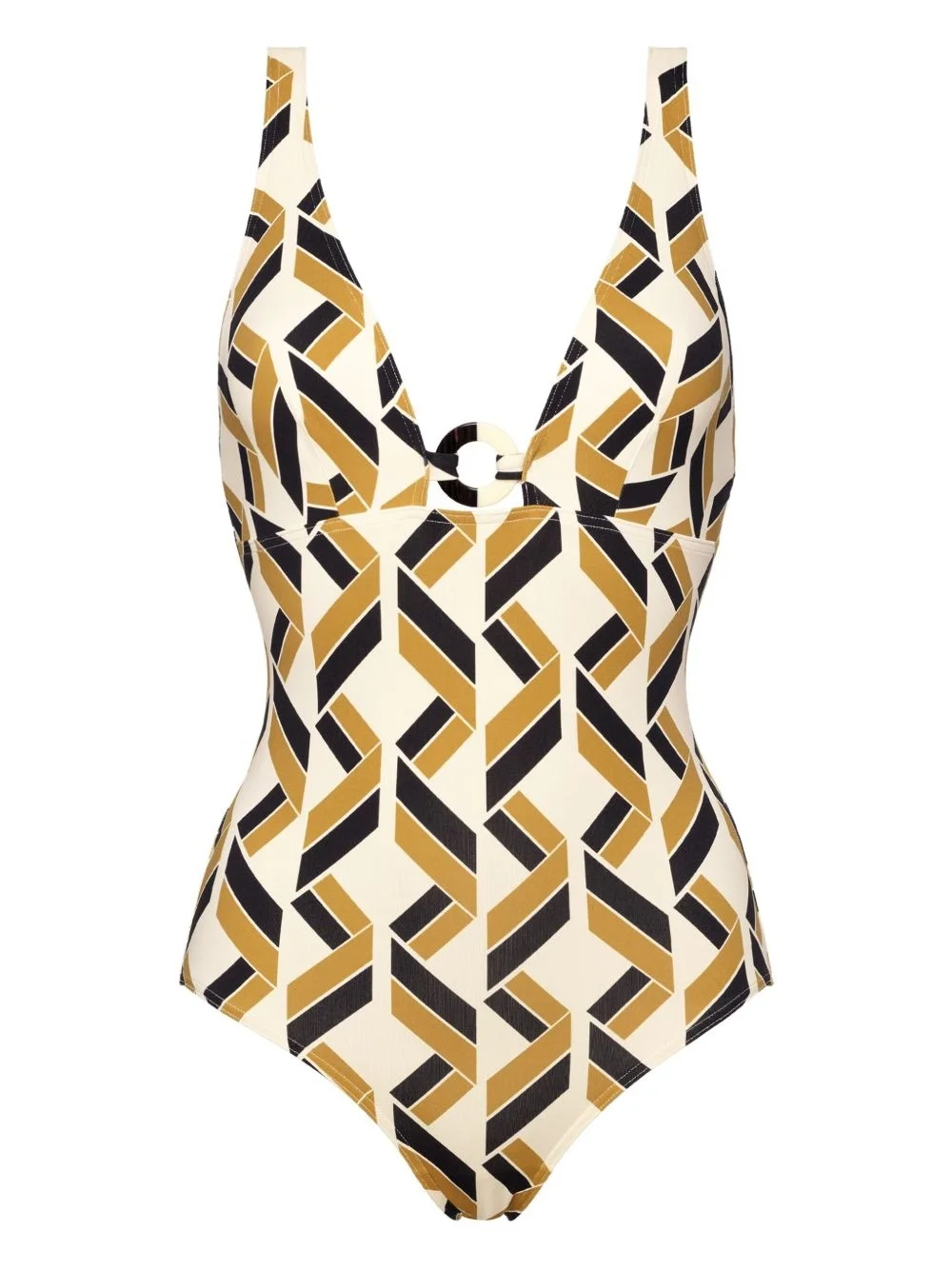 Party swimsuit Highlights - Cream - Geometric print - V-neck - Open back - Be mindful to try on swimwear over your own garments. Made in France Composition Polyamide 77%, Spandex/Elastane 23% SIZE & FIT FittingInformation This piece fits small – take one size up Washing instructions Machine Wash