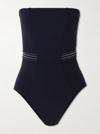 Eres' 'Evening Petillant' swimsuit is designed with a silver-striped grosgrain band, that both defines your waist and adds a bit of sparkle to the simple design. It's made from the label's signature peau douce fabric and has a strapless neckline. Size & Fit - Fits true to size, take your normal size - Medium brief coverage - Model is 175cm/ 5'9", bra size 32C and is wearing a size FR 36 Model measurements: - Bust: 85cm/ 33.5” - Waist: 63cm/ 25” - Hip: 90cm/ 35.5” Details & Care - Black stretch-polyamide - Pull on - 77% polyamide, 23% elastane - Machine wash - Lotion, sunscreen, oil and chlorine can cause discoloration of this item; this is not a manufacturing defect. Please follow care instructions to keep your swimwear in the best condition