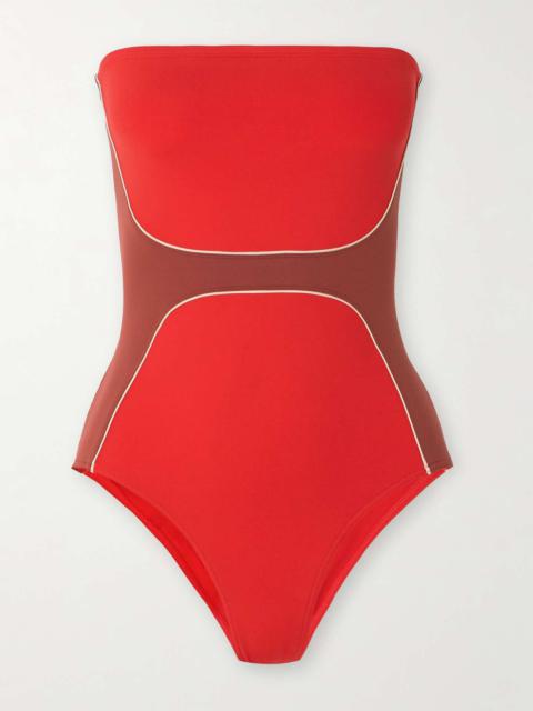 EDITORS'NOTES It would be easy to overlook the prowess behind Eres' poolside styles, but each one is informed by over 50 years of expertise. This 'Saturne' swimsuit is cut from smooth stretch fabric with high-cut legs that give the illusion of taller proportions. Swishy embellished ties along the narrow shoulders will dazzle in the sunlight. Small to size. See Size & Fit notes. SIZE & FIT - Fits small to size, take one size larger than normal - Medium brief coverage - Model is 175cm/ 5'9" and is wearing a FR 38 DETAILS & CARE - Dark-green stretch-polyamide - Ties at shoulders - 84% polyamide, 16% elastane - Machine wash - Designer color: Moss Green - Lotion, sunscreen, oil and chlorine can cause discoloration of this item; this is not a manufacturing defect. Please follow care instructions to keep your swimwear in the best condition