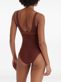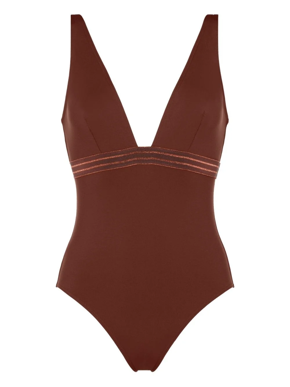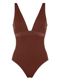 Sillage plunge-neck swimsuit Highlights - Rich brown - Deep v neckline - Contrasting striped detail - Wide shoulder straps - High-cut leg openings - Be mindful to try on swimwear over your own garments. Made in Italy Composition Polyamide 77%, Spandex/Elastane 23% Washing instructions Machine Wash