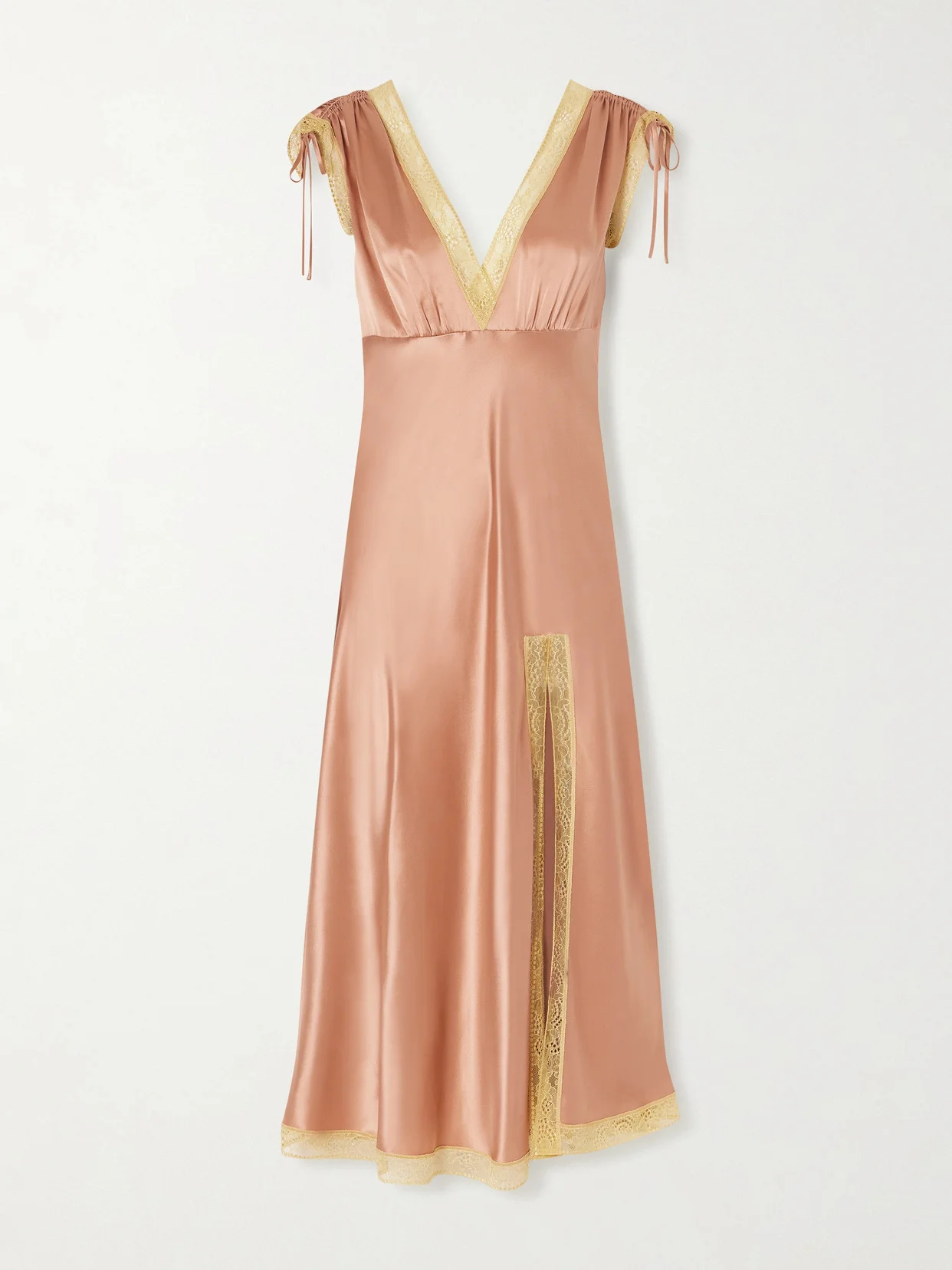 Eres' nightdress has a '30s-inspired bias-cut that contributes to its timeless appeal. Made from lustrous silk-satin, it's framed with a lace border and bares a slit at the leg. The shoulders are subtly ruched and dangle with sweet bows.