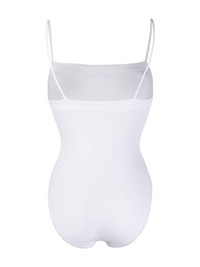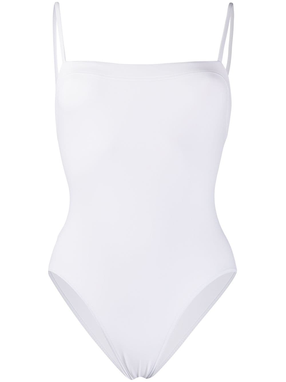 spaghetti strap swimsuit White spaghetti strap swimsuit from Eres featuring a slip-on style, a straight neck and a stretch fit. Swimwear must be tried on over your own garments. Made in France Composition Outer: Polyamide 77%, Spandex/Elastane 23% Lining: Polyamide 42%, Polyester 32%, Spandex/Elastane 26% Washing instructions Machine Wash