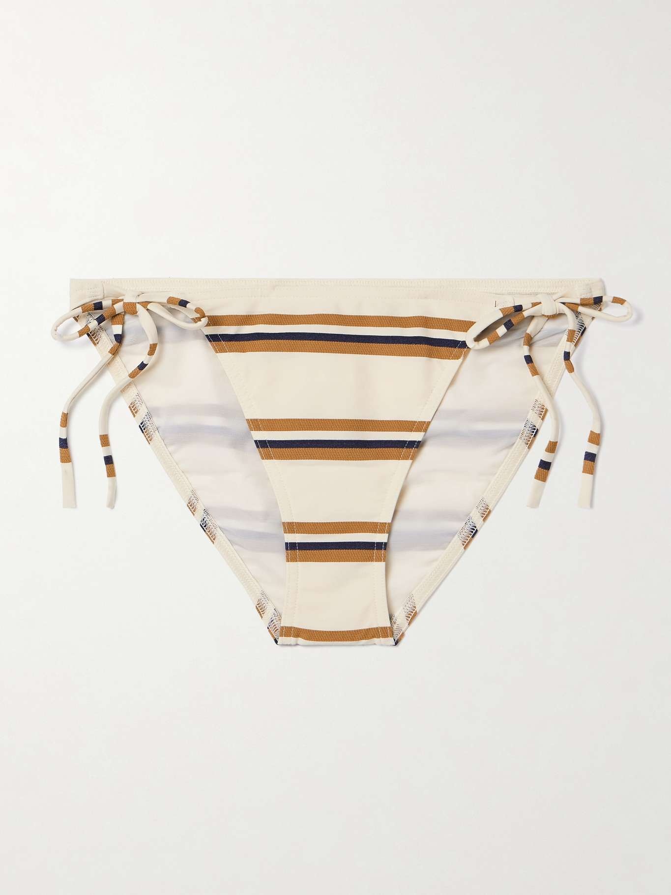 EDITORS'NOTES Eres' 'Mariniere Navy' bikini briefs are jacquard-woven with thin stripes inspired by classic Breton styles. Wear yours with the matching 'Flots' top, adjusting the side ties to a comfortable fit. SIZE & FIT Model measurements: - Fits true to size, take your normal size - Low-rise with minimal brief coverage - Model is 177cm/ 5'10" and is wearing a FR 38 - Bust: 79cm/ 31" - Waist: 66cm/ 26" - Hip: 89cm/ 35" DETAILS & CARE - Cream, tan and navy stretch-polyamide - Ties at sides - 82% polyamide, 18% elastane; lining: 68% polyamide, 32% elastane - Hand wash - Lotion, sunscreen, oil and chlorine can cause discoloration of this item; this is not a manufacturing defect. Please follow care instructions to keep your swimwear in the best condition