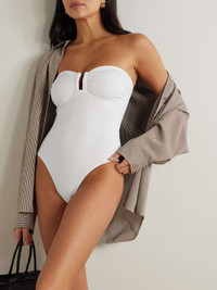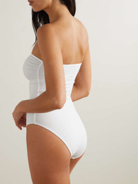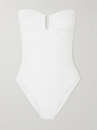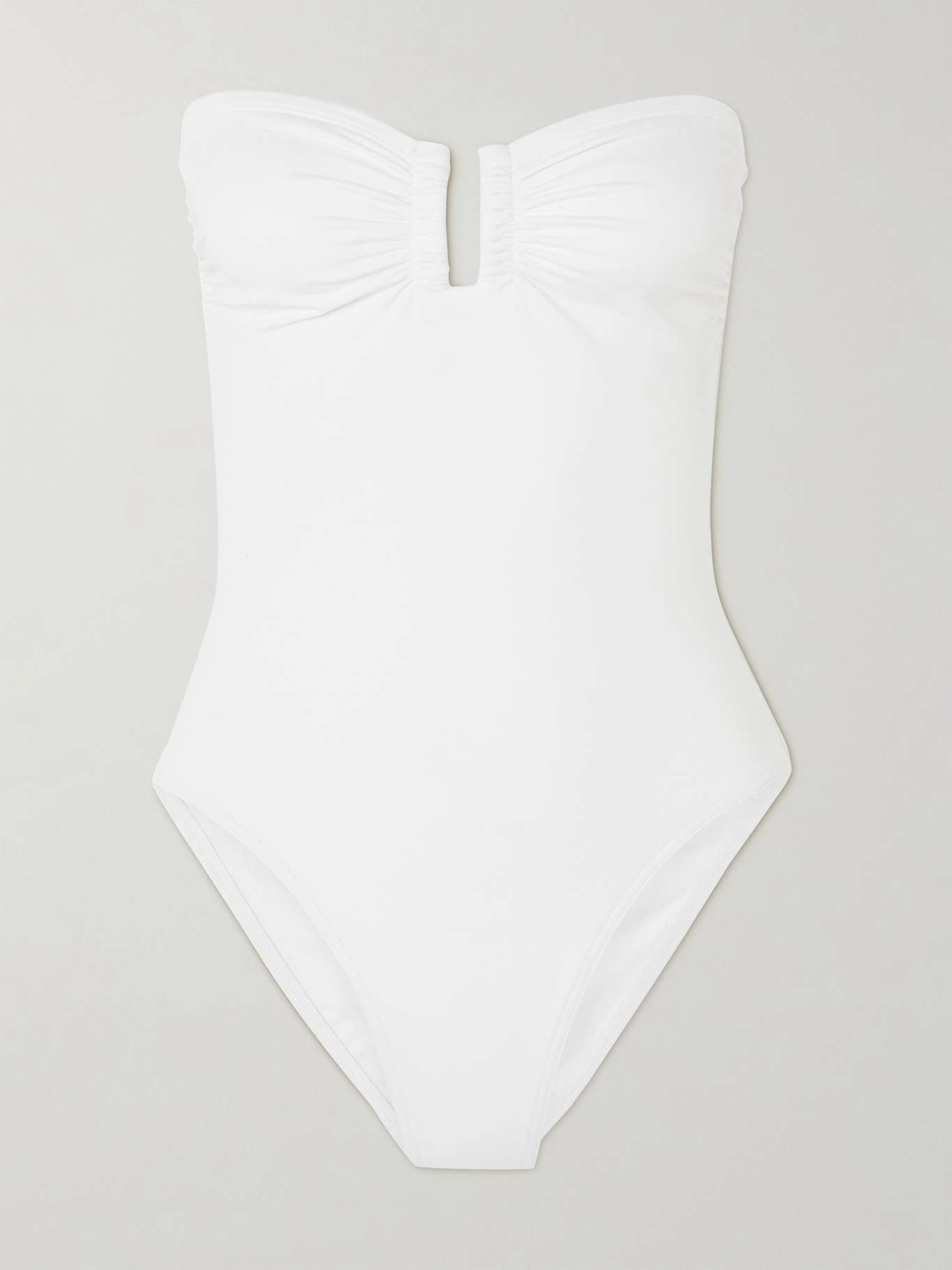 EDITORS'NOTES A timeless summer staple, Eres' sleek 'Cassiopee' bandeau swimsuit is cut from the brand's signature peau douce fabric for an ultra smooth silhouette. It's designed with a concealed U-ring for structure and a gummed internal band that keeps it securely in place. SIZE & FIT Model measurements: - Fits true to size, take your normal size - Medium brief coverage - Model is 175cm/ 5'9", bra size 32D and is wearing a size FR 38 - Bust: 83cm/ 32.5" - Waist: 67cm/ 26" - Hip: 89cm/ 35" DETAILS & CARE - White stretch-polyamide - Pulls on - 68% polyamide, 32% elastane - Machine wash - Lotion, sunscreen, oil and chlorine can cause discoloration of this item; this is not a manufacturing defect. Please follow care instructions to keep your swimwear in the best condition