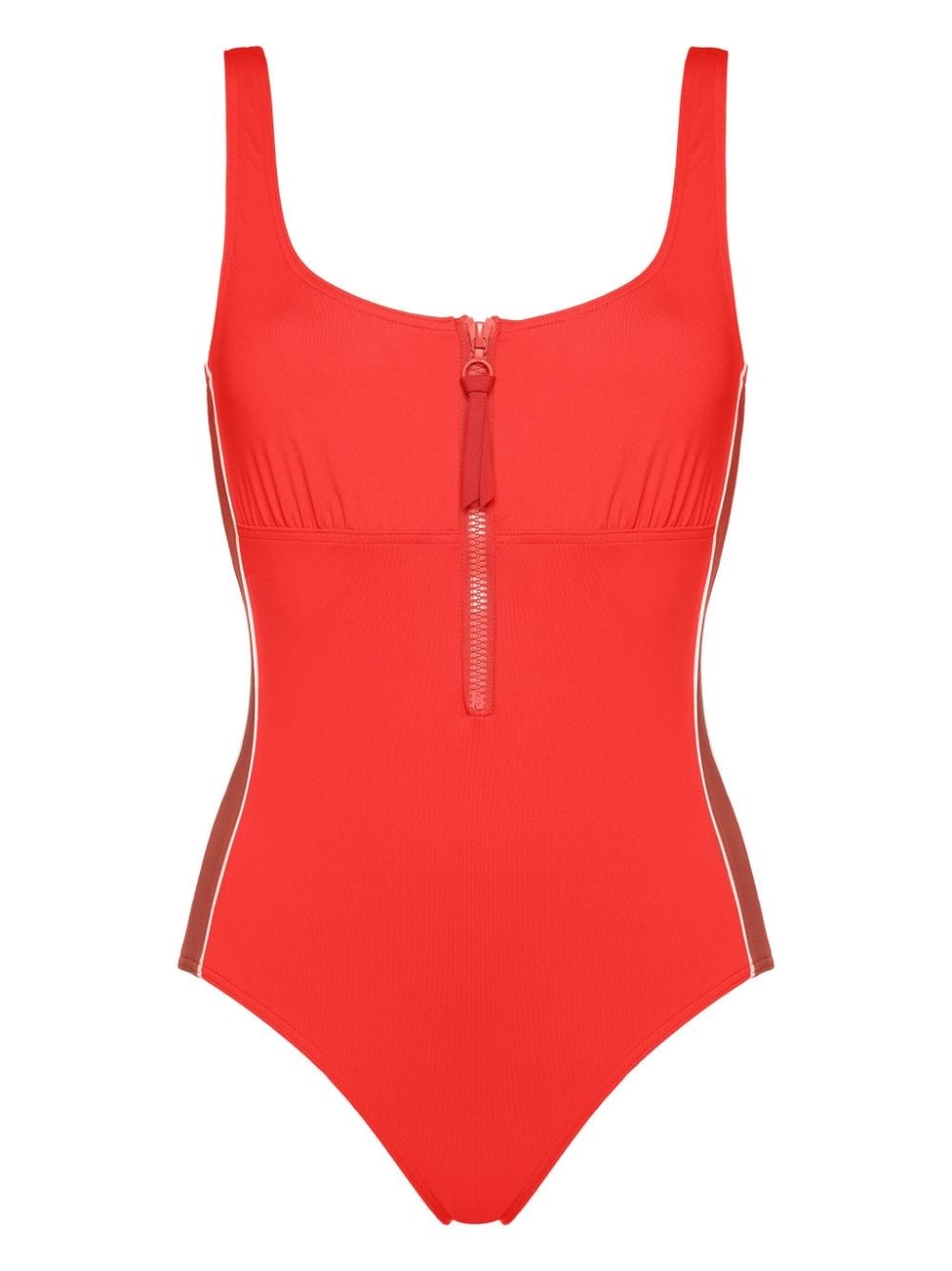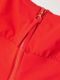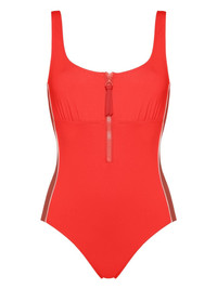 EDITORS'NOTES Eres' 'Athletic Tribune' swimsuit is perfect for those who enjoy being active at the beach. Made from signature peau douce , it's designed with wide straps and an underbust seam for support. The stripes tracing the sides add to its sporty feel, while the zipped neckline can be adjusted for more or less coverage. SIZE & FIT Model measurements: - Fits small to size, take one size larger than normal - Medium brief coverage - Model is 175cm/ 5'9" and is wearing a FR 38 - Bust: 79cm/ 31" - Waist: 66cm/ 26" - Hip: 89cm/ 35" DETAILS & CARE - Red, brick and white stretch-polyamide - Pulls on - 84% poyamide, 16% elastane - Hand wash - Lotion, sunscreen, oil and chlorine can cause discoloration of this item; this is not a manufacturing defect. Please follow care instructions to keep your swimwear in the best condition