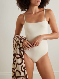 EDITORS'NOTES Part of the 'Paradise' line, Eres' 'Tropicalia' swimsuit has been made in France from a ribbed version of the signature peau douce . It has a minimalist design complete with a straight neckline and slim straps, and can easily double as a bodysuit, too. SIZE & FIT Model measurements: - Fits true to size, however those who are between sizes should take the larger size - Medium brief coverage - Model is 175cm/ 5'9", bra size 30A and is wearing a FR 38 - Bust: 79cm/ 31" - Waist: 66cm/ 26" - Hip: 89cm/ 35" DETAILS & CARE - White stretch-polyamide - Pulls on - Fabric1: 90% polyamide, 10% elastane; fabric2: 84% polyamide, 16% elastane - Machine wash - Designer color: Percale - Lotion, sunscreen, oil and chlorine can cause discoloration of this item; this is not a manufacturing defect. Please follow care instructions to keep your swimwear in the best condition Small to size. See Size & Fit notes.