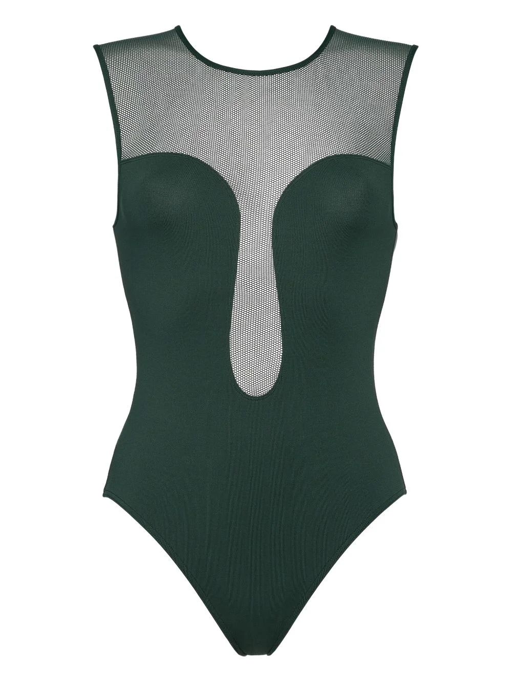 Unique one-piece swimsuit Highlights - Dark green - Mesh panelling - Open back - Clasp fastening - Round neck - Be mindful to try on swimwear over your own garments. Made in Italy Composition Polyamide 77%, Spandex/Elastane 23% Washing instructions Machine Wash
