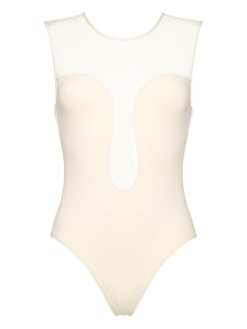 Unique one-piece swimsuit Highlights - Off-white - Mesh panel - Open back - Crew neck - Sleeveless - Clasp fastening - Be mindful to try on swimwear over your own garments. Made in Italy Composition Polyamide 77%, Spandex/Elastane 23% Washing instructions Machine Wash