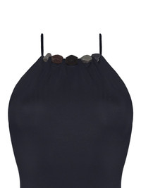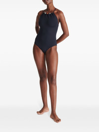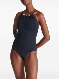 Venus swimsuit Highlights - Navy blue - Stretch-design - Rear tie fastening - Bead embellishment - Ruched detailing - Rear criss-cross straps - Scoop back - Classic bottoms - Be mindful to try on swimwear over your own garments. Made in Italy Composition Polyamide 77%, Spandex/Elastane 23% SIZE & FIT FittingInformation This piece fits small – take one size up Washing instructions Machine Wash