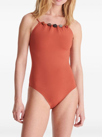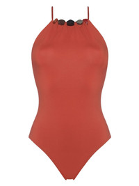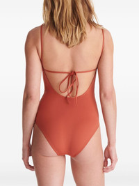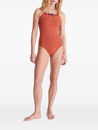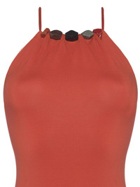 Venus swimsuit Highlights - Terracotta brown - Stretch-design - Rear tie fastening - Spaghetti straps - Bead embellishment - Ruched detailing - Scoop back - Classic bottoms - Be mindful to try on swimwear over your own garments. Made in Italy Composition Polyamide 84%, Spandex/Elastane 16% SIZE & FIT FittingInformation This piece fits small – take one size up