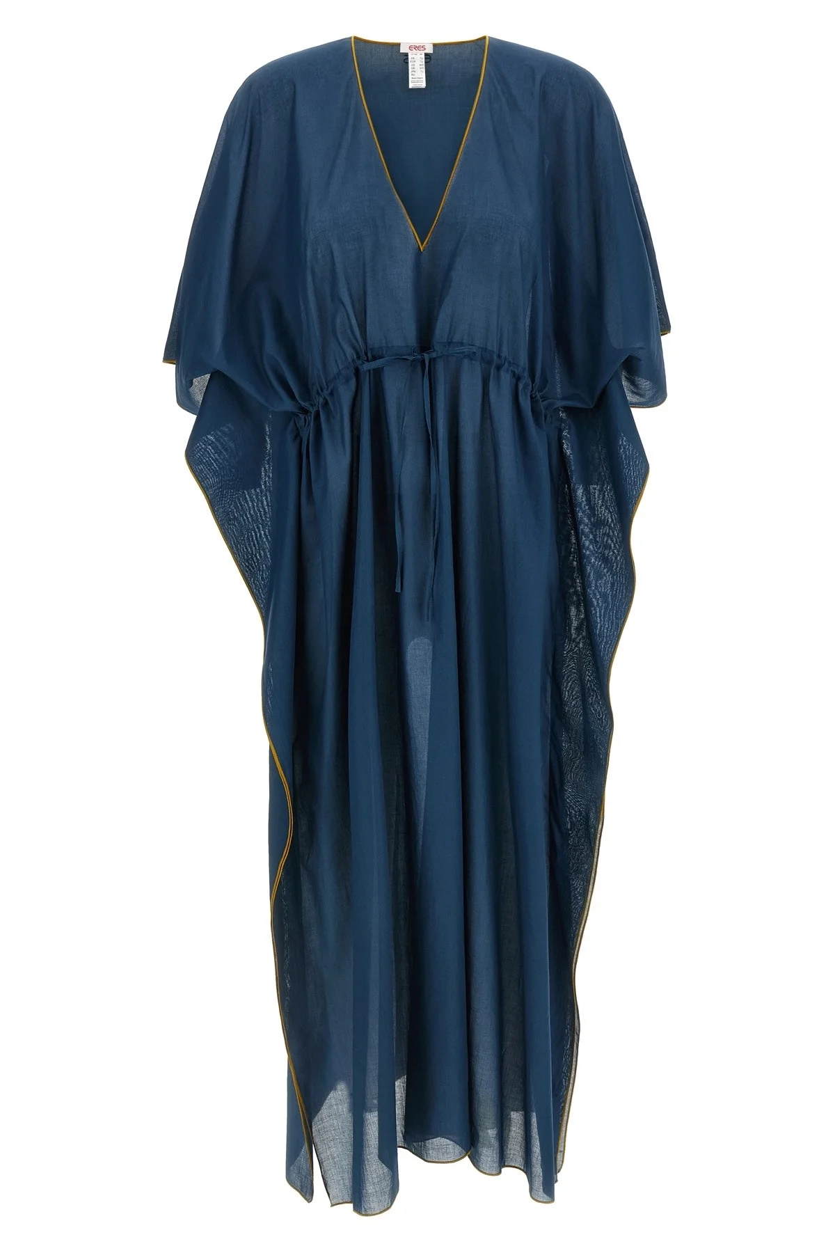 cod. 202427OCEAN26A Long 'Voilier' cotton voile dress with contrast piping, caftan style, underbust drawstring, V-neck, wide short sleeves. Color: Green Size & Fit: ONE SIZE Composition: 100% cotton Made in: Bulgaria