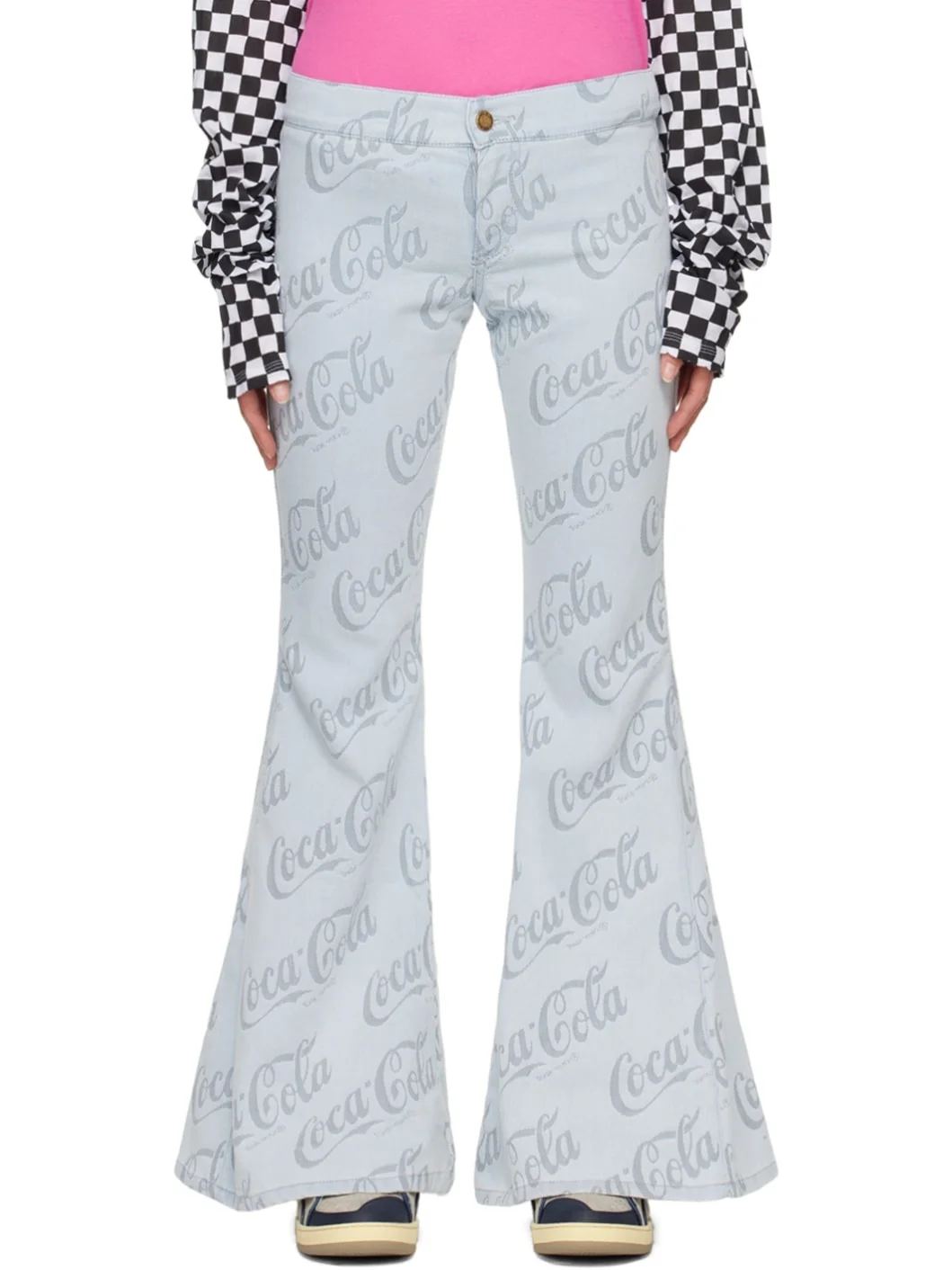 Flared stretch denim jeans. Jacquard logo pattern throughout. · Low-rise · Zip-fly · Logo-engraved antiqued copper-tone hardware Part of the ERL Coca-Cola® capsule collection. Supplier color: Grey coca cola 52% cotton, 46% polyester, 2% elastane. Made in Tunisia 241260F069001
