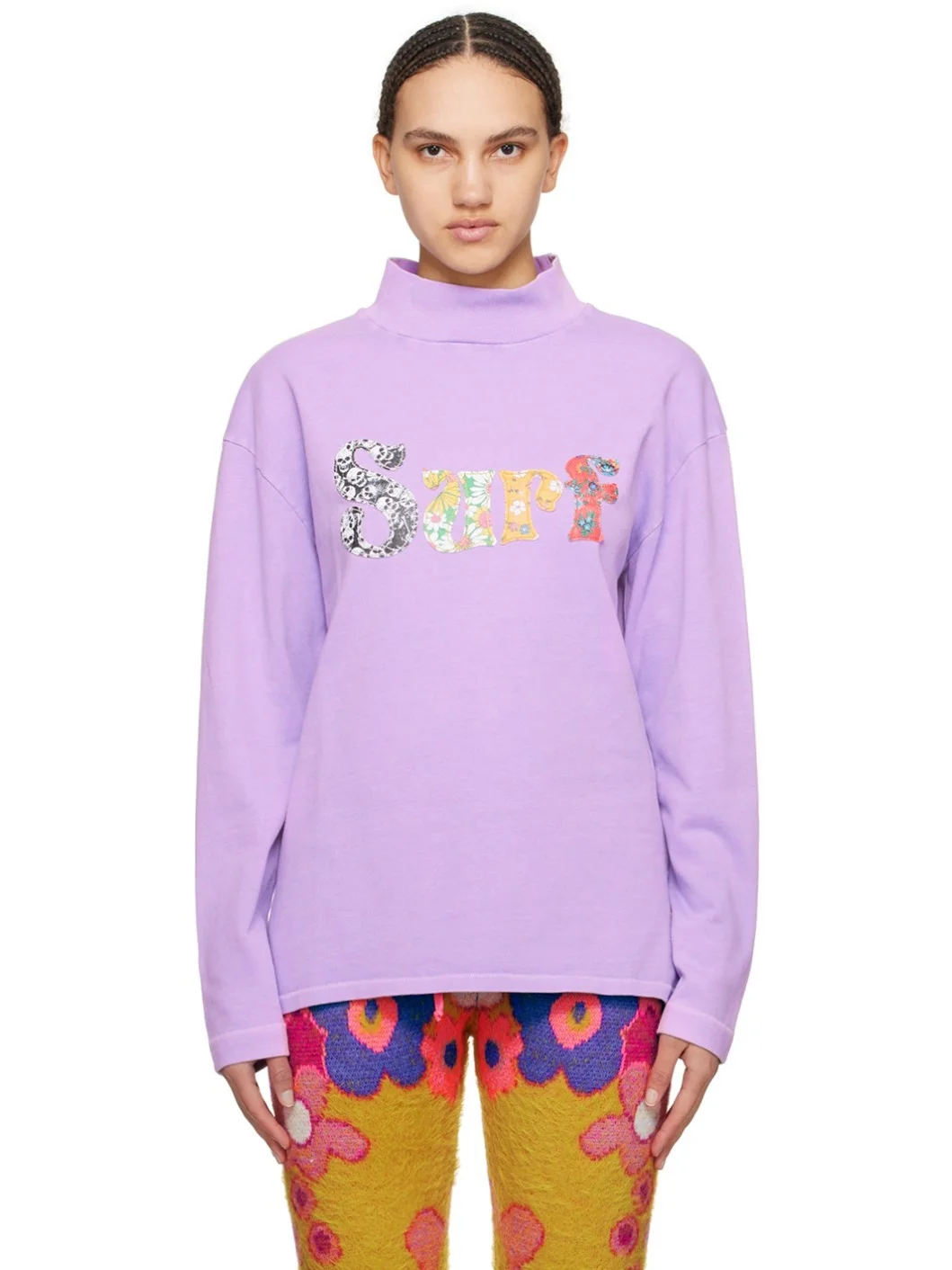 Cotton jersey T-shirt. · Rib knit mock neck · Graphic appliques at front · Vented side seams · Dropped shoulders Supplier color: Purple 100% cotton. Made in Turkey 241260F110008