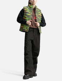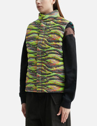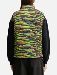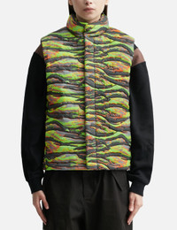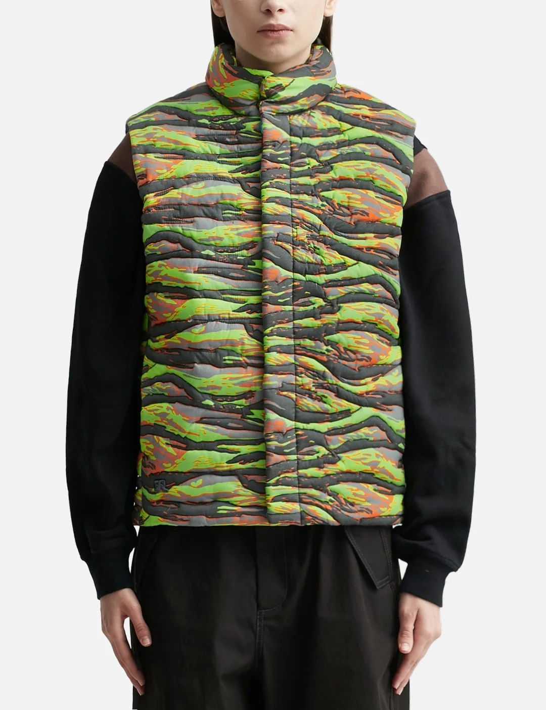- ERL - Unisex Printed Quilted Puffer Vest - Green camo pattern throughout - Front snap button fastening - High neck - Duck down and feather padding - Side slip pockets - Logo embroidery detail - Color: Green Rave Camo - Material: 100% Cotton; Filling: 80% Duck Down, 20% Duck Feather - See more Vests and Clothing SIZING - Model wears size M - Model measures: Height 189cm, Chest 32”/81cm, Waist 27”/69cm, Hip 35.5”/90cm