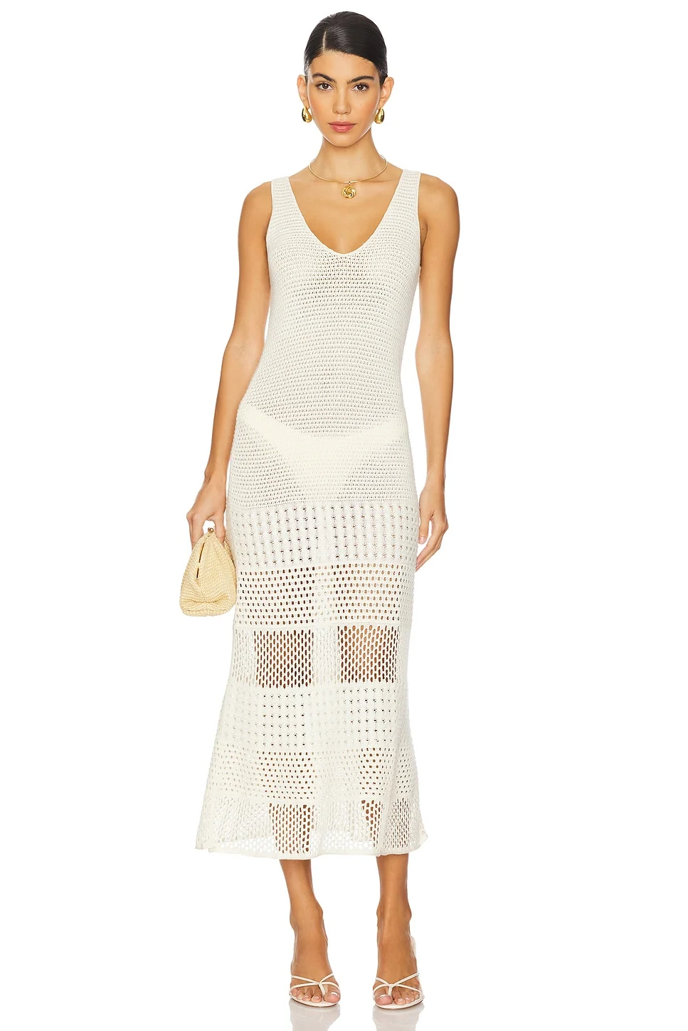 - 100% cotton - Made in Peru - Dry clean only - Unlined - Pull-on styling - Open knit fabric - Garment is made with a semi-sheer fabric, undergarments can show through - Revolve Style No. ESCF-WD11 - Manufacturer Style No. HS24DRESS6IVO