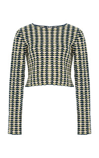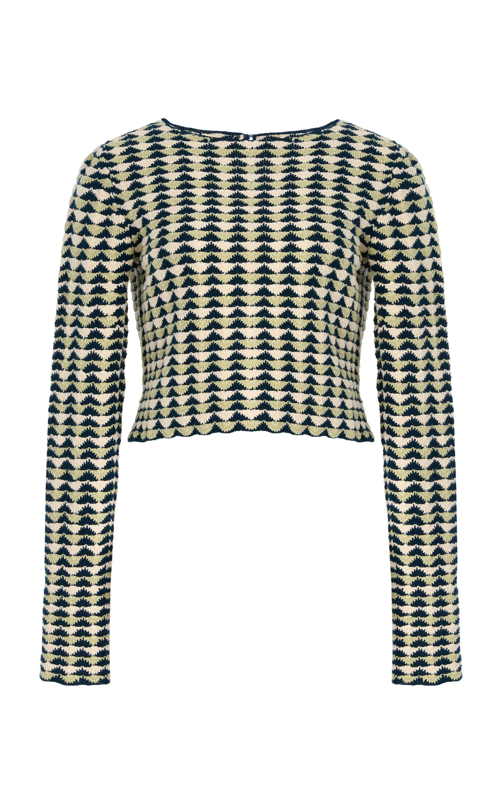 Founded in 2013 by sisters Chiara and Giuliana Macchiavello, ESCVDO is inspired by and dedicated to the duo’s Peruvian heritage, focusing on ancestral weaving techniques with a modern take and ethical approach. Handmade in Peru, the 'Totora' boat-neck top has a slightly cropped silhouette made from a geometric-patterned crocheted cotton. Pair with the matching skirt. PRODUCT DETAILS - Spring '25 - Button fastening - Composition: 100% cotton - Designer color: Blue Teal/ Ivory/ Palette - Dry clean - Made in Peru SIZE & FIT - Our model is wearing a size Small - Model is 5'10" with a 30" bust, 24" waist, and 34" hip - Designed for a slim fit