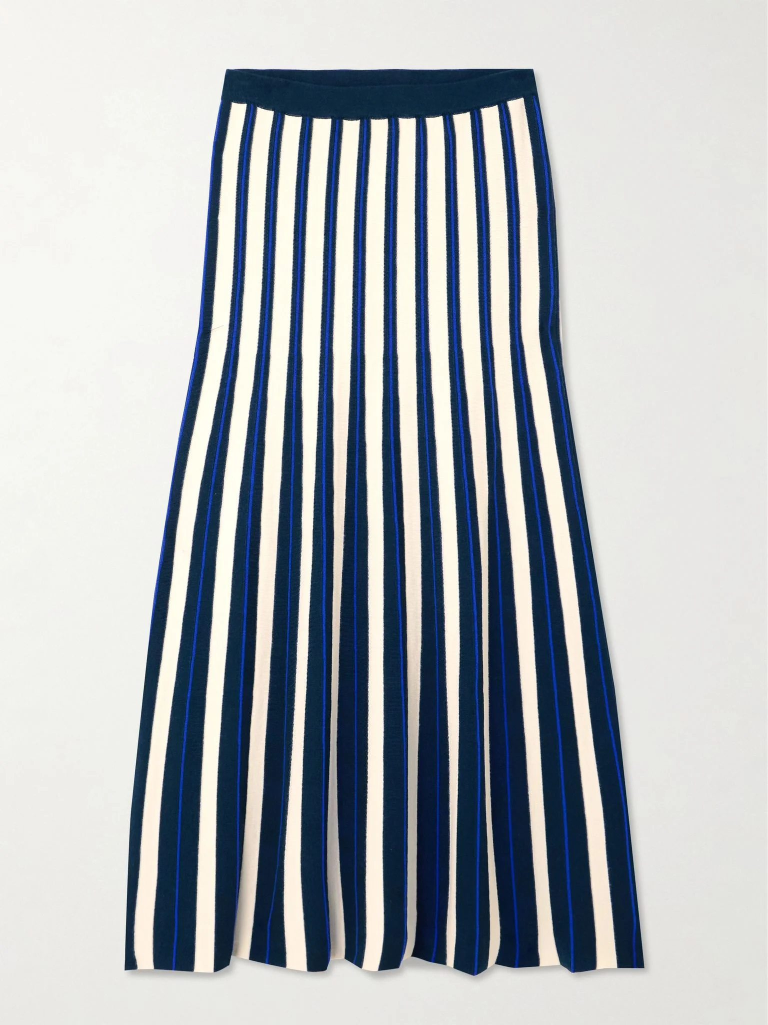 ESCVDO's 'Manglar' skirt is made from certified organic cotton by female craftspeople from the label's initiative with Knitting Hope, which helps honor traditional techniques and heritage. It's designed to hug the hips before flaring out to a floaty hem and has a striking striped pattern. Lower-Impact Materials. This product is made using at least 50% lower-impact materials or ingredients. Responsible Craftsmanship. This product promotes artisanal skills and a brand that invests in communities and adheres to fair-trade principles. Find out more about our NET SUSTAIN criteria here. Size & Fit - Fits true to size, take your normal size - Midi-length, designed to be worn at the waist - Mid-weight - Model is 177cm/ 5'10" and is wearing a size Small Model measurements: - Bust: 80cm/ 31.5" - Waist: 60cm/ 23.5" - Hip: 89cm/ 35" Details & Care - Tonal-blue and cream organic cotton - Slips on - 100% organic cotton - Dry clean