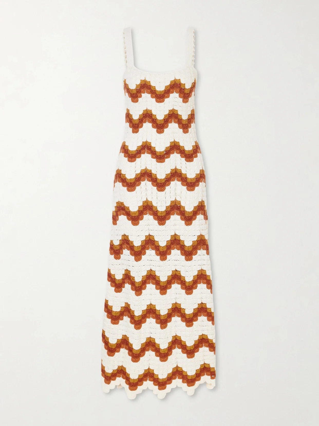 ESCVDO pays tribute to traditional Peruvian textiles in its collections, using ancestral weaving techniques. This 'Marea' maxi dress is crocheted from cotton to create a contrasting zigzag motif and designed to skim your curves before flaring at the scalloped hem. Take advantage of the slender straps to frame your favorite pendant.