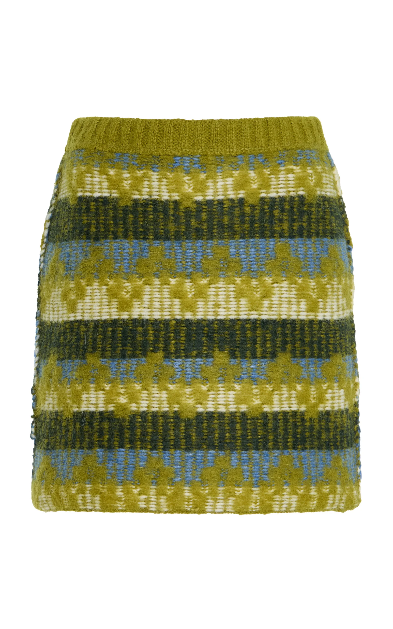 Founded in 2013 by sisters Chiara and Giuliana Macchiavello, ESCVDO is inspired by and dedicated to the duo’s Peruvian heritage, focusing on ancestral weaving techniques with a modern take and ethical approach. Handcrafted in Peru, the 'Salkantay' mini has a fitted silhouette knit from an alpaca-wool jacquard. Wear yours with the matching sweater. PRODUCT DETAILS - Fall '25 - Slip on - Composition: 80% baby alpaca, 20% wool - Designer color: Green/ Sky Blue - Dry clean - Handmade in Peru SIZE & FIT - Our model is wearing a size Small - Model is 5’10” with a 30” bust, 24” waist, and 34” hip