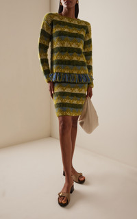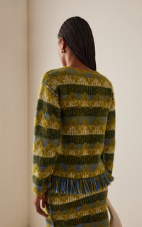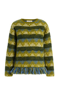 Founded in 2013 by sisters Chiara and Giuliana Macchiavello, ESCVDO is inspired by and dedicated to the duo’s Peruvian heritage, focusing on ancestral weaving techniques with a modern take and ethical approach. Handcrafted in Peru, the 'Salkantay' crewneck sweater has an oversized silhouette knit from an alpaca-wool jacquard with a fringed hem. Wear yours with the matching mini. PRODUCT DETAILS - Fall '25 - Slip on - Composition: 80% baby alpaca, 20% wool - Designer color: Green/ Sky Blue - Dry clean - Handmade in Peru SIZE & FIT - Our model is wearing a size Small - Model is 5’9.5" with a 32" bust, 24" waist, and 35.5" hip