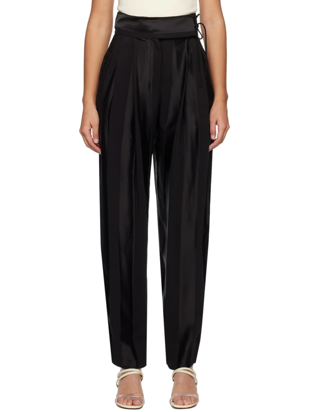 Tapered viscose-blend satin and jersey trousers. · Paneled construction · High-rise · Wraparound panel with self-tie straps at waistband · Four-pocket styling · Zip-fly Supplier color: Black Body: 86% viscose, 13% wool, 1% cotton. Lining: 100% acetate. Made in Australia 241475F087001